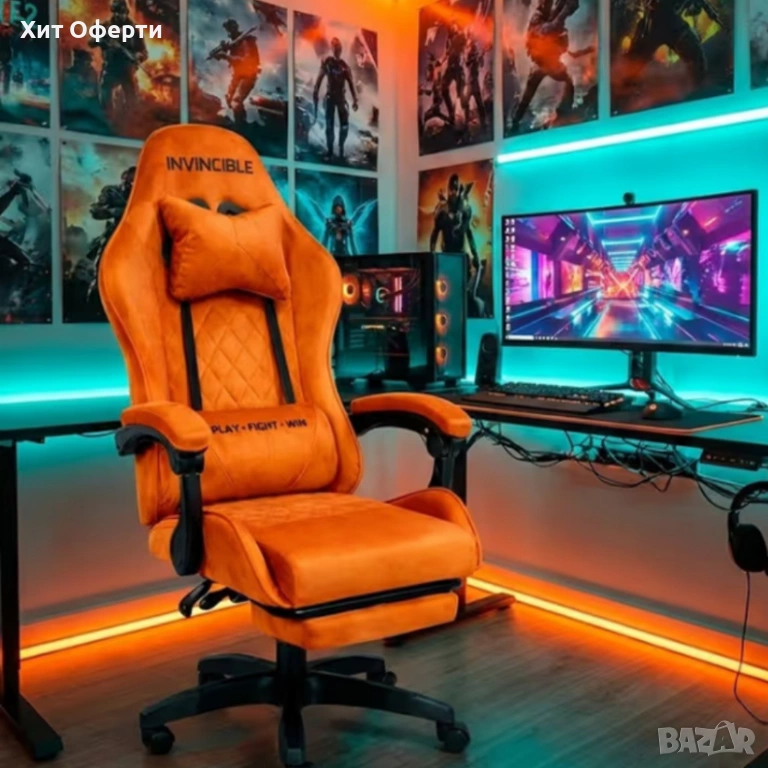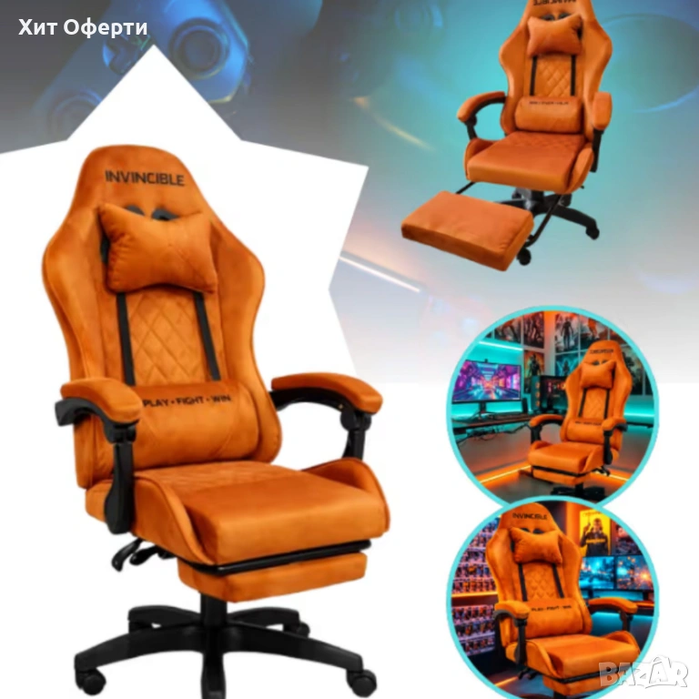 Оранжев велурен геймърски стол с поставка за крака – ергономичен, метална рамка → Обява 53249882