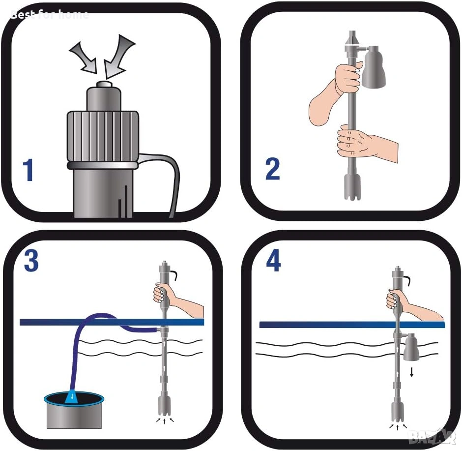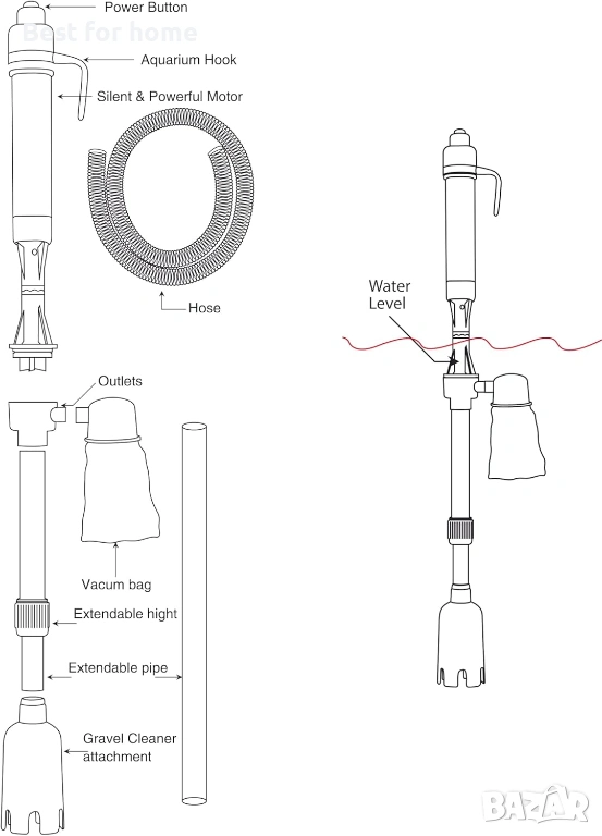 Ефективно почистване на дъното: Уредът засмуква отпадъците и ги отделя от чакъла или пясъка, като ги събира в специална филтърна торбичка, която лесно се почиства или подменя.