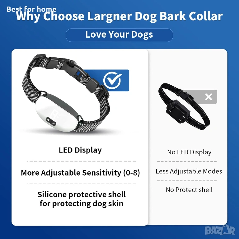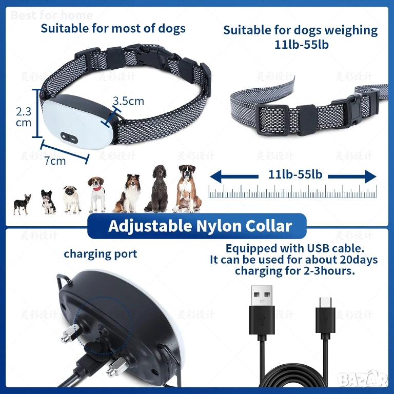 【Защо да изберете нашийник против лаене Largner】Нашийникът за кучета Largner се предлага с вградена USB акумулаторна батерия, която може да се зареди напълно за 2-3 часа и издържа повече от 10 дни употреба. Нещо повече, нашийникът против лаене Largner за кучета е водоустойчив по IP67. Нашийникът против лаене на кучета Largner осигурява най-високите нива на защита срещу прах и вода, така че няма нужда да го сваляте, докато кучето ви се къпе, плува или се разхожда в дъжда с вас.