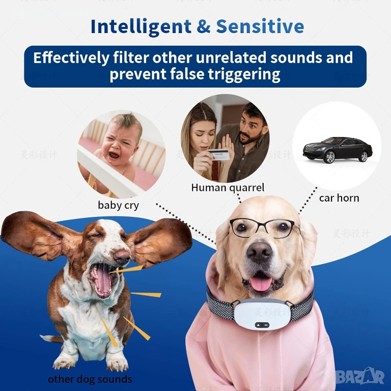 【Грижа за вашето куче】Ако устройството за контрол на лая на кучето се задейства 7 пъти без прекъсване, то автоматично влиза в защитно състояние за 1 минута и не може да се задейства. Може да се задейства отново след 1 минута. Това ще ви помогне да предпазите кучето си от прекалено наказание. Нещо повече, каишката за лай с интелигентен сензор ще разпознае честотата на лая на вашето куче и децибелите, за да филтрира ефективно другите звуци, предотвратявайки фалшиво задействане и предпазвайки кучето ви от ненужно наказание.