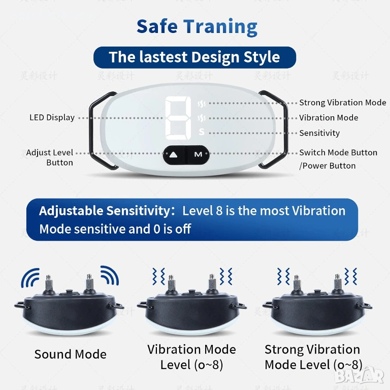 Нашийник против лай - Шоков нашийник за кучета, презареждащо се устройство против лай със 7 нива на чувствителност и 8 нива на удар и вибрации, нашийник за дресировка на кучета, устройства за контрол на лая на кучета.