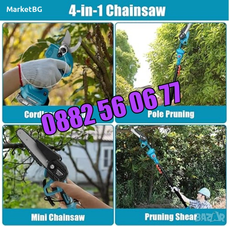 Комплект от акумулаторна лозарска ножица, акумулаторен мини верижен трион с 15 см шина и телескопичен прът 3 в 1 36V 8Ah
