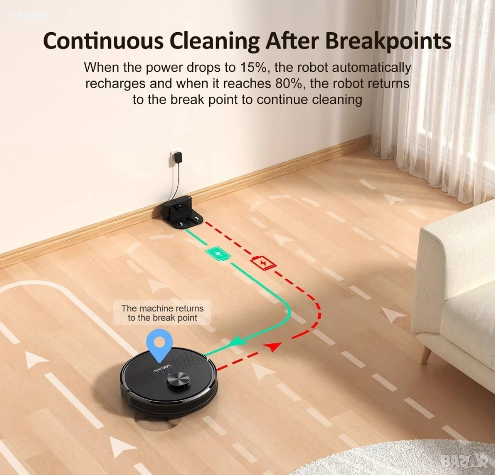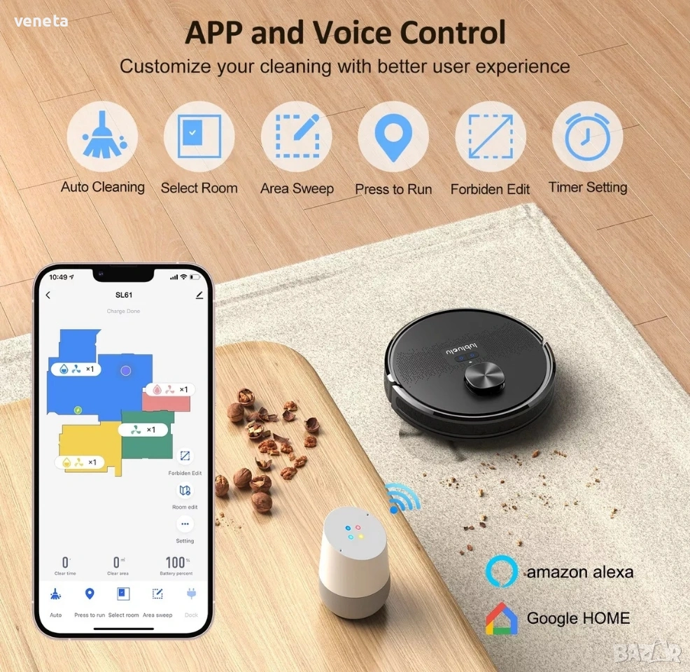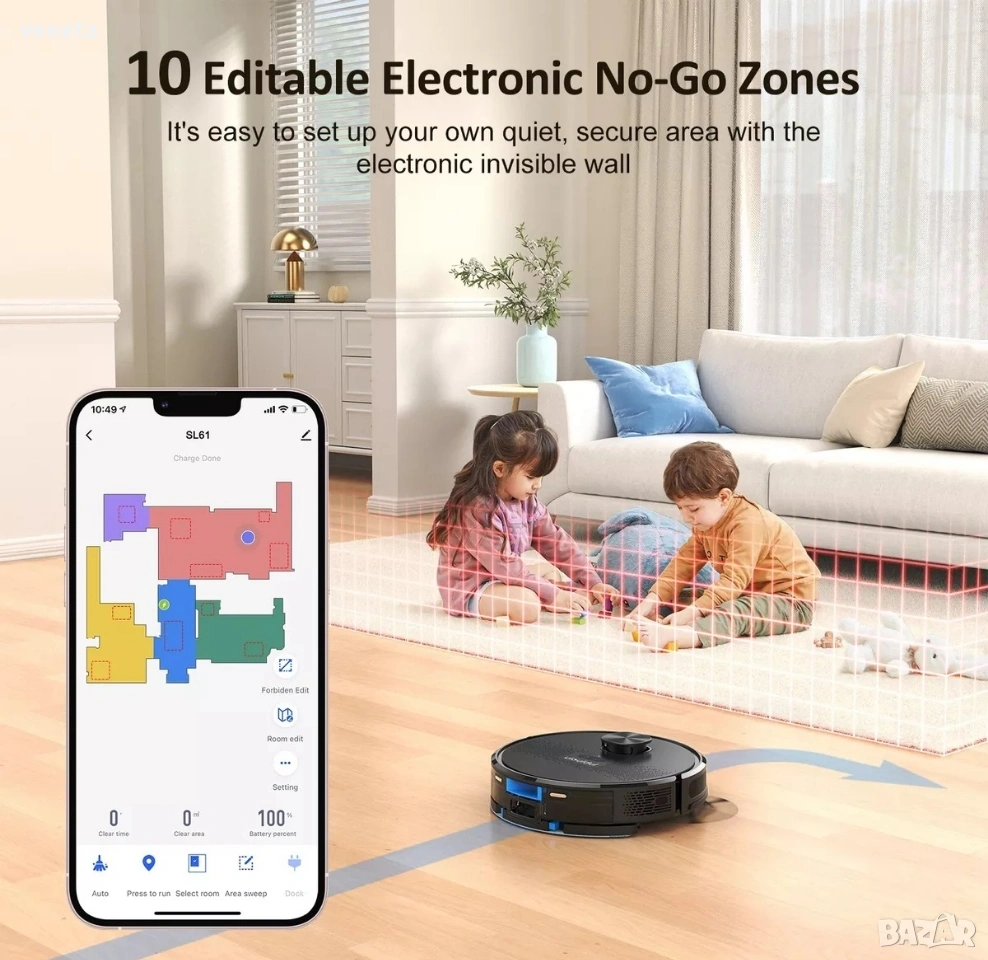 Интелигентни функции: Поддържа 5 различни карти за етажи, 10 забранени зони (No-Go zones) и автоматично откриване на килими за увеличаване на мощността