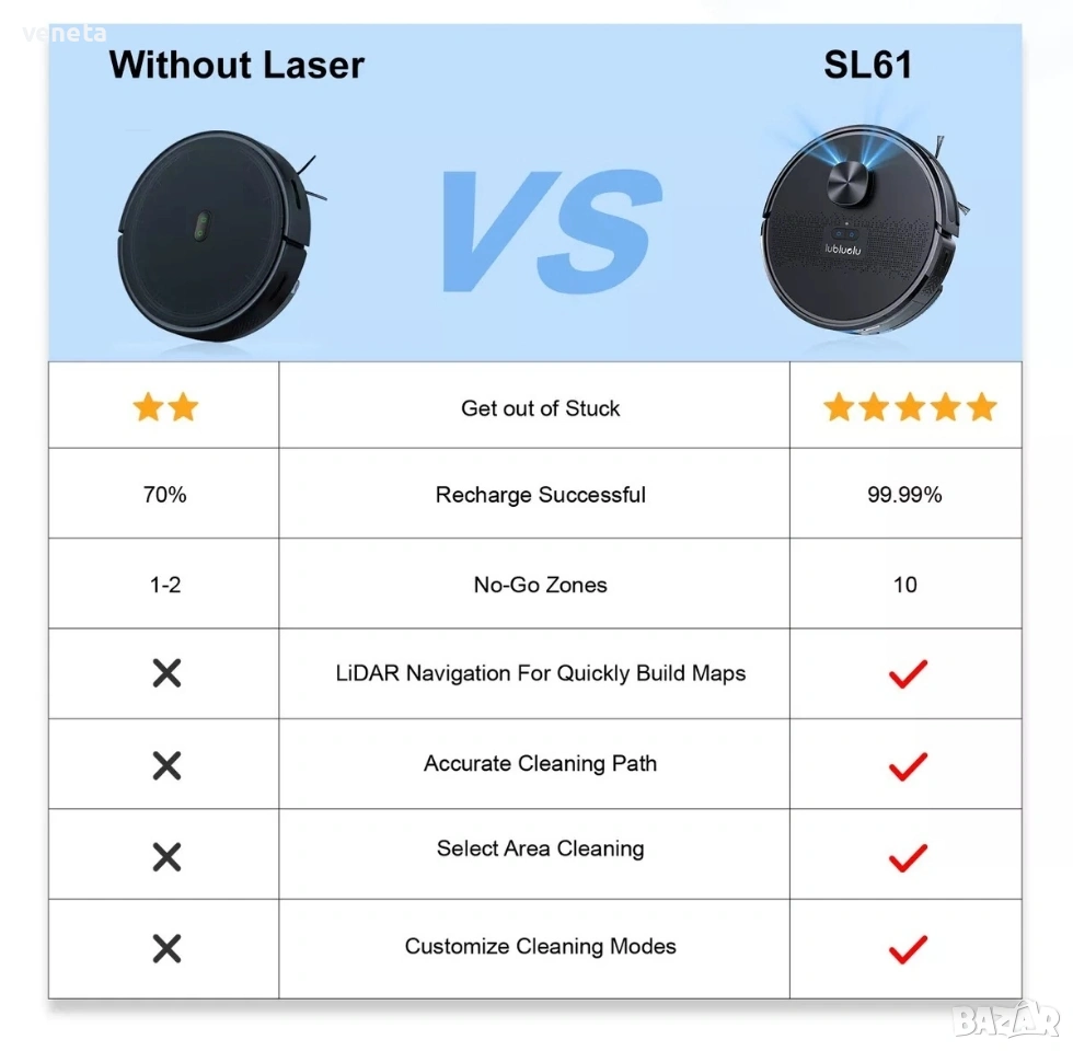 Lubluelu SL61 е 3-в-1 робот прахосмукачка с мощност 4500Pa, LDS 9.0 LiDAR навигация и моп, предназначен за ефективно почистване на косми от домашни любимци, килими и твърди подове. Той картографира дома 3 пъти по-бързо, поддържа до 5 карти, зониране, 10 забранени зони и управление чрез приложение/глас
