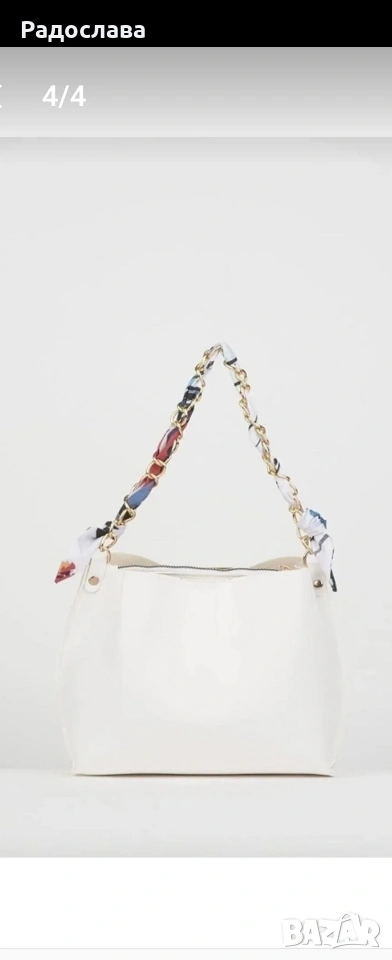 Дамска бяла мека кожена чанта, с верижна дръжка за ръка, която допълнително е украсена с шарено шалче. В чантата има и дълга кожена дръжка, която допълнително се закача, за да се носи през рамо. Кожата е изкуствена, но е много мека. Има две прегради с цип посредата. Размера е ширина 26см., височина 20см. Чантата е нова, подарена ми е, но я продавам защото не нося малки чанти.