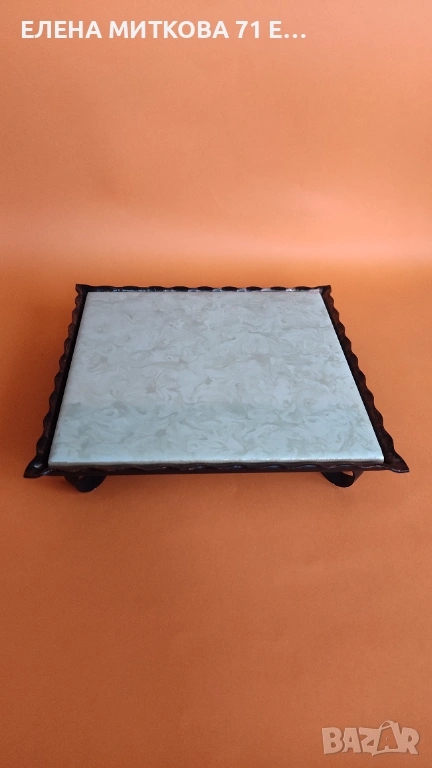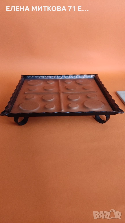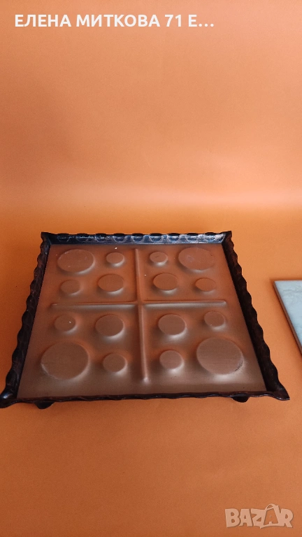 ***По-голямата подложка-много масивна-изработена от ковано желязо и мед-с 4 крачета-размери 16 х 16 см,вис.3 см , тегло 730 гр/плочката се сваля/-цена 12 евро/23.47 лв