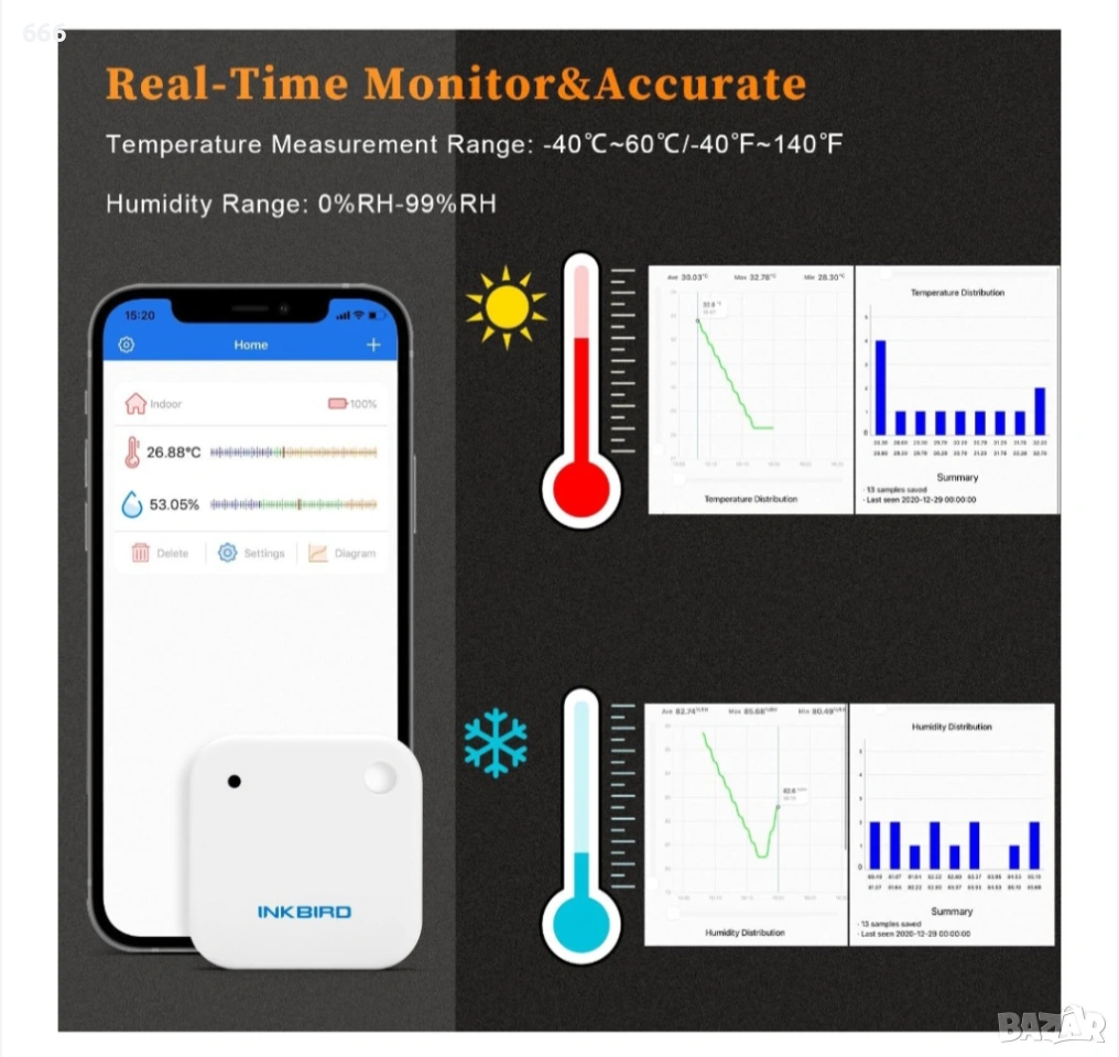 Bluetooth връзка: Подобрен Bluetooth 5.0, обхват на свързване 30 м/98 фута (без препятствия). Температурен диапазон: -40°F~140°F/-40°C ~60°C, Диапазон на влажност: 0~99% RH, Точност на измерване: ±0,3°C/±0,5°F, ±3% RH.
