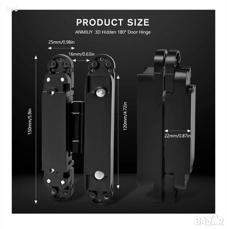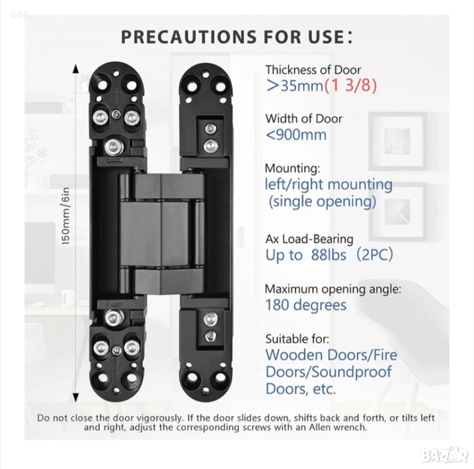 3.(Размер): Тази скрита панта за врата е с размери 6×2,5×1 инча и е подходяща за врати с дебелина над 35 мм (1 3/8 инча). Ширина на вратата
