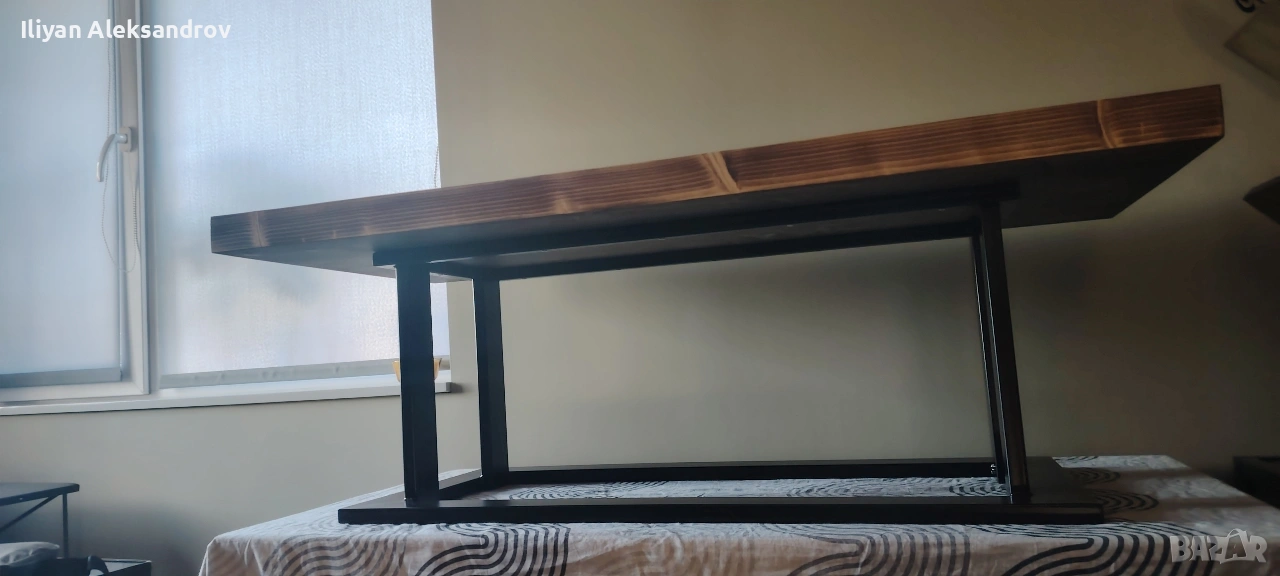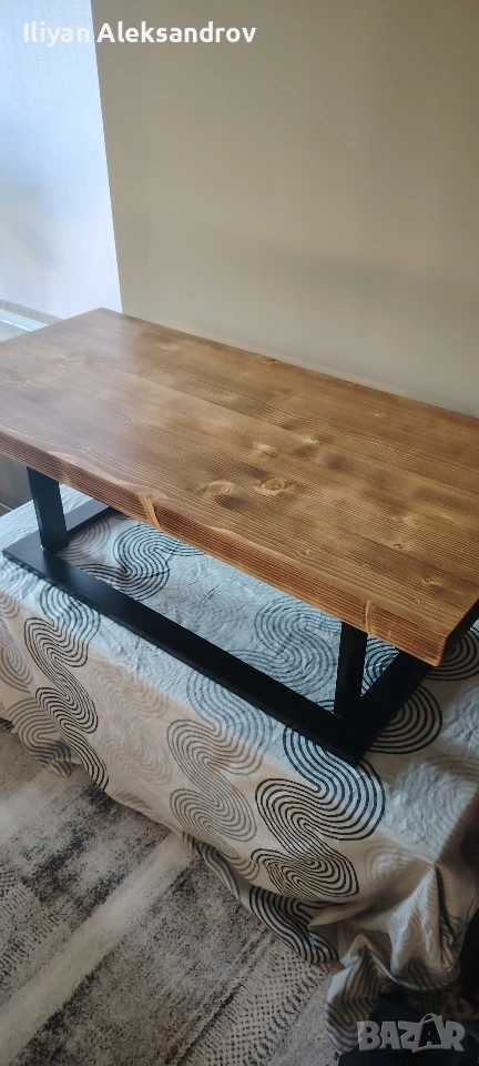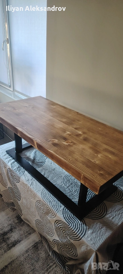 Плотът е слепен бор с дебелина 5см.Обработен с байцово масло и полиран и запечатан с пчелен восък и ленено масло.