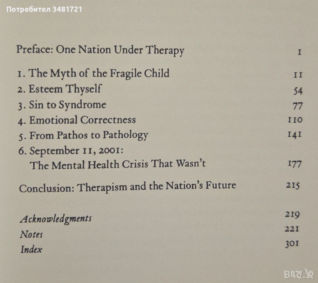 Американците традиционно ценят високо самоувереността и силата на духа. През последните десетилетия, обаче, се наблюдава възход на терапевтична етика, която разглежда американците като емоционално недоразвити, психически крехки и изискващи помощта на специалисти по психично здраве. В наши дни, с налична книга за всяко едно заболяване, съдебен иск за всяко оплакване и телевизионно предаване за всеки възможен проблем, те са изложени на риск да деградират вродената си способност да се справят с житейските предизвикателства. Опирайки се на установената наука и здравия разум, Кристина Сомърс и д-р Сали Сател разкриват как „терапевтизмът“ и разрастващата се индустрия за травми са проникнали в живота на хората, с множество тревожни последици, сред които: