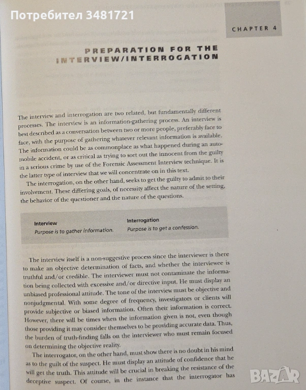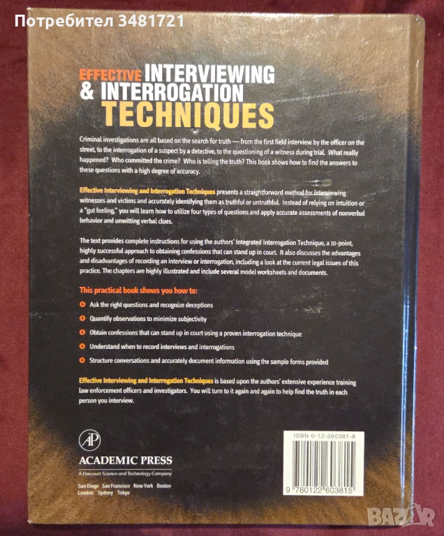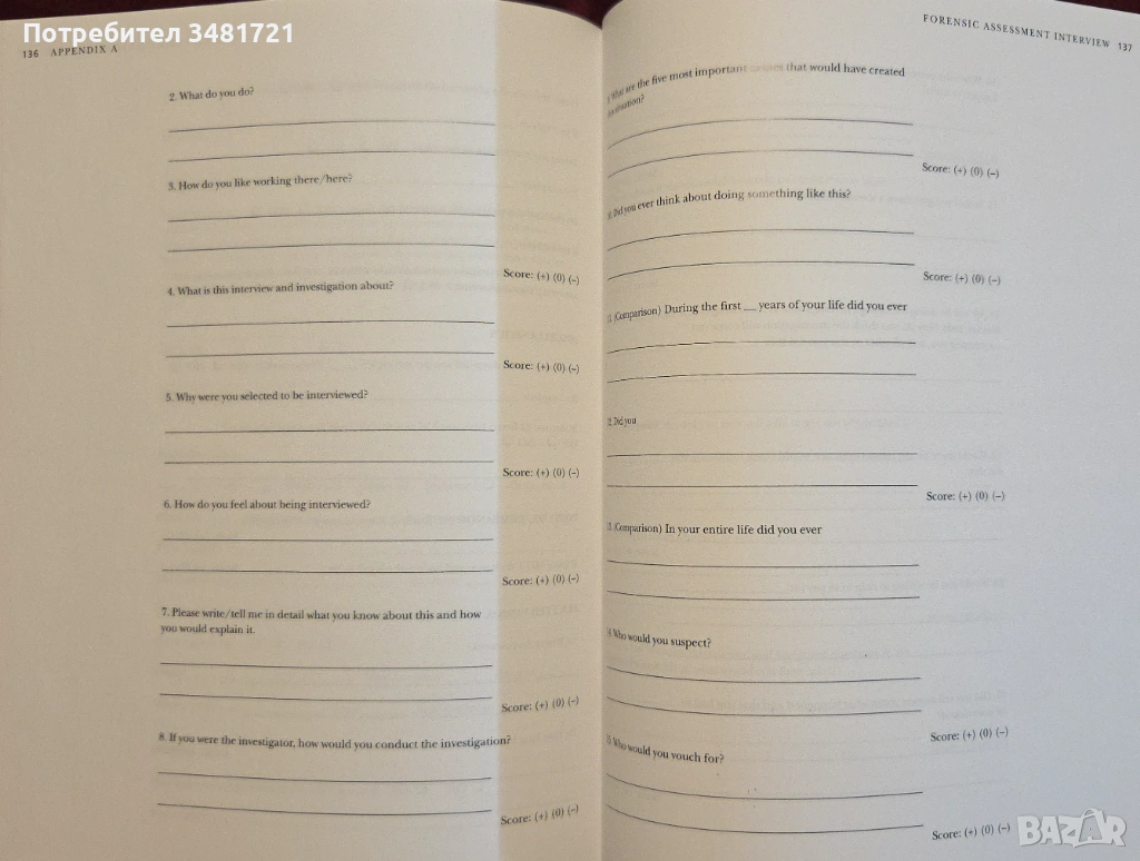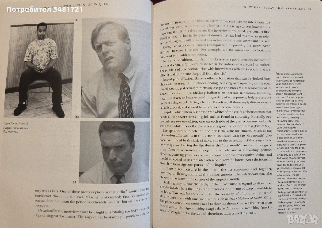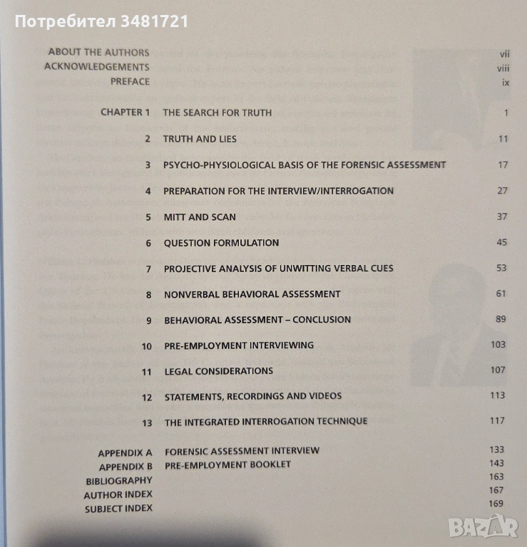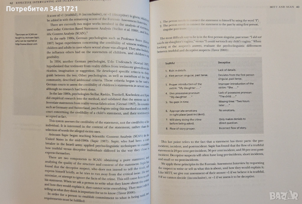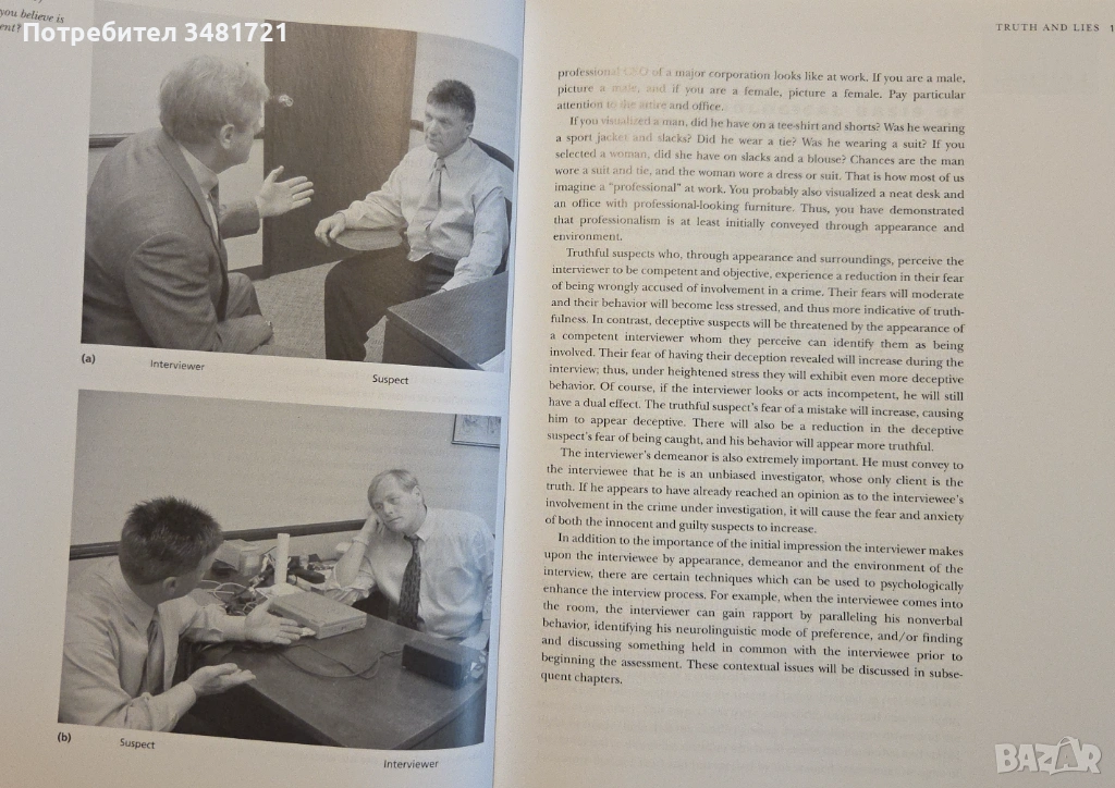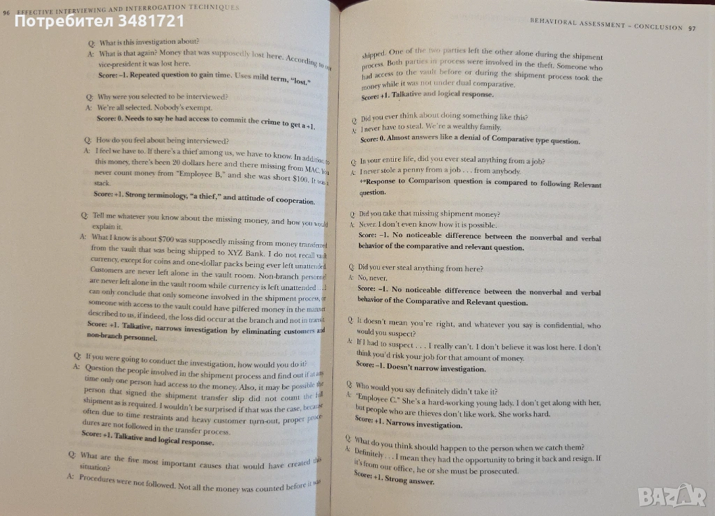 Книгата представя практични и лесни методи за интервюиране на свидетели и жертви, разпит на заподозрени и точното им идентифициране като искрени или нечестни, като методите и техниките са представени в текст, снимки и илюстрации. Целта на авторите е да помогнат да не се разчита на интуиция, а интервюиращите да се научат как да използват четири вида въпроси и да прилагат точни оценки на невербалното поведение и вербалните улики. Те, също така, могат да научат как да определят количествено своите наблюдения и да оценяват числено истинността на всеки заподозрян, за да сведат до минимум субективността. Книгата включва също как да се използва интегрираната техника за разпит на авторите - 10-точков, изключително успешен подход за получаване на потвърдени от съда признания. Разгледани подробно са също предимствата и недостатъците на записването на интервю или разпит, както и някои от настоящите правни аспекти на тези процеси. Добавени в книгата са примерни работни листове и формуляри, сред които - формуляри за съгласие, формуляр за техника на интервю за съдебна оценка, формуляр за числена оценка, примерно признание и брошура за сигурност преди наемане на работа.