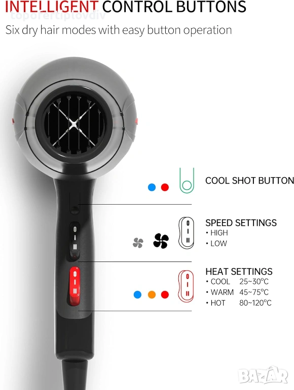 ТЕХНОЛОГИЯ С ОТРИЦАТЕЛНИ ЙОНИ НА СИНЯ СВЕТЛИНА: Този професионален сешоар е оборудван с 5 милиона концентрирани отрицателни йонни емитери, които премахват статичното електричество чрез сушене със сешоар, като спомагат за намаляване на къдренето и статичното електричество, оставяйки косата гладка и блестяща. Светлосините отрицателни йони могат да хидратират косата, правейки я блестяща, което помага за антистатичното действие и задържане на влагата и предотвратява увреждане от прегряване.