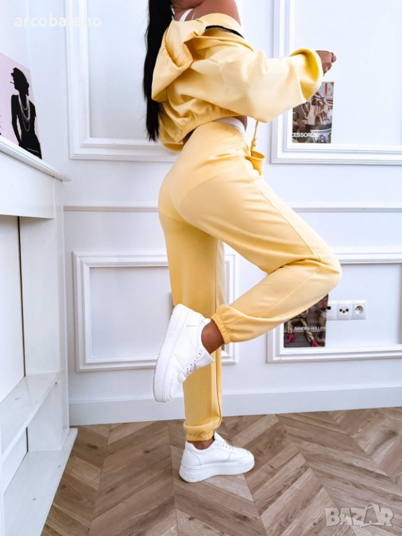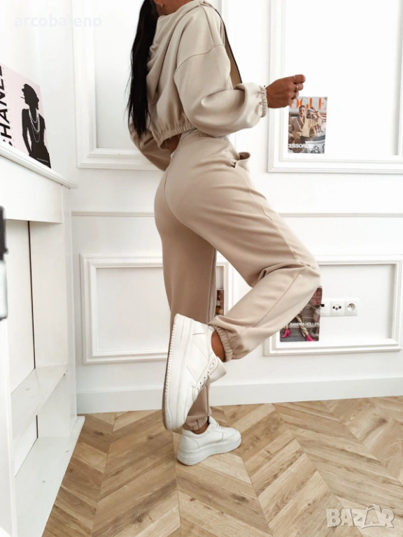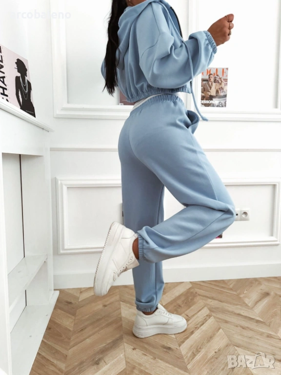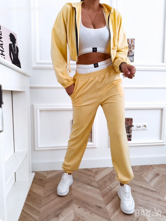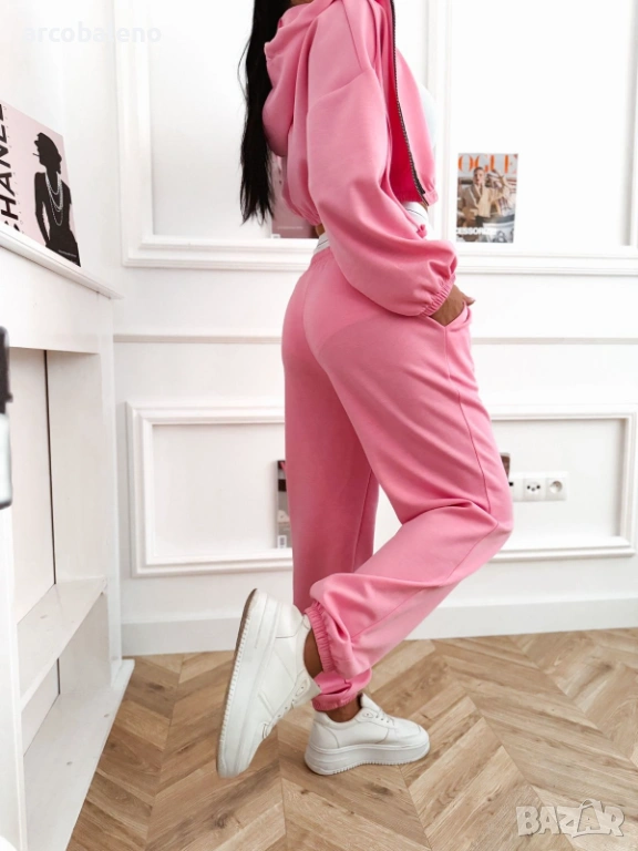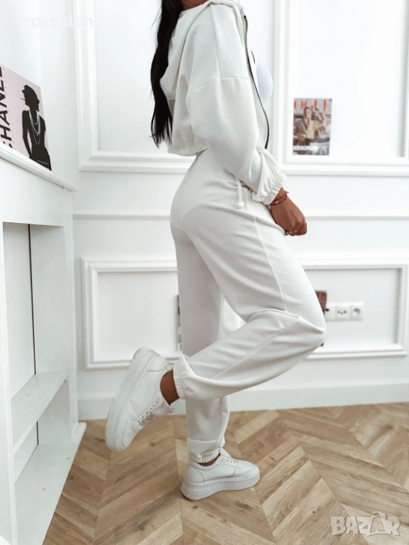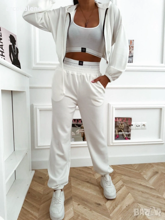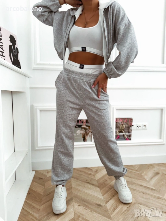 Дамски комплект, състоящ се от къс суичър с цип, панталон с висока талия и бял спортен топ.