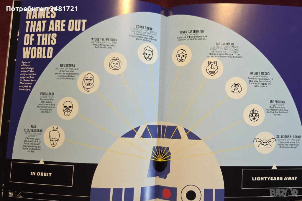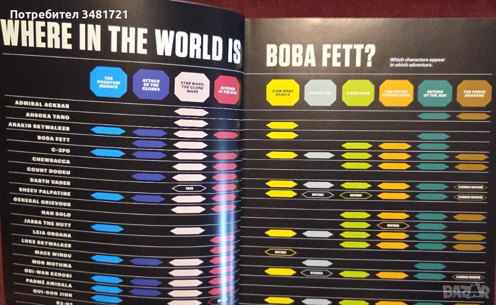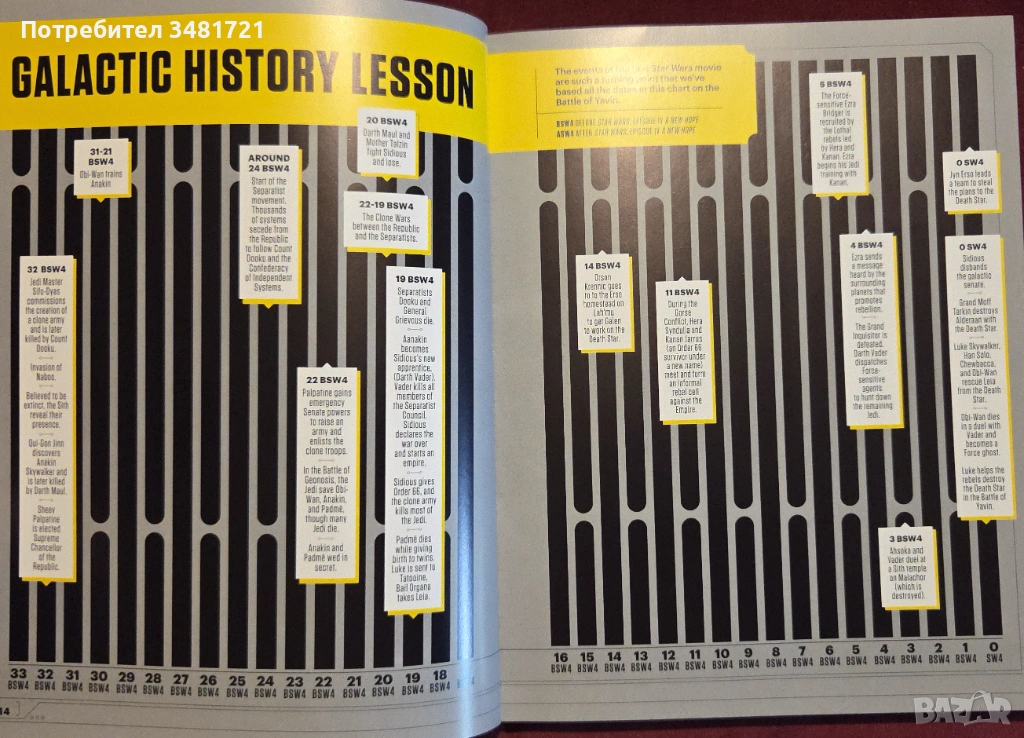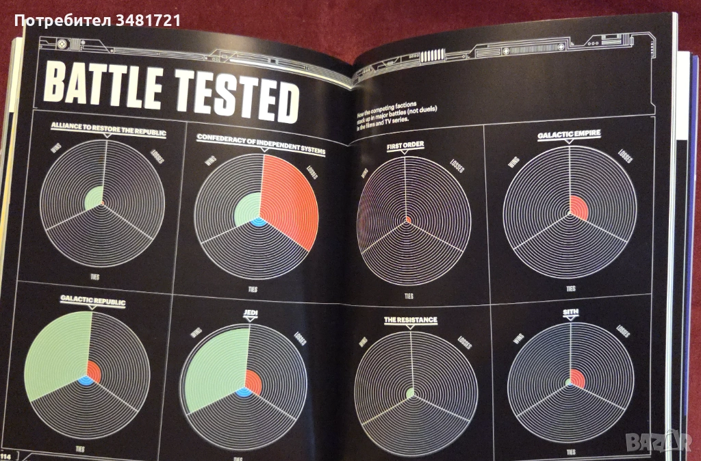 От графика на звездните обекти във вселената на Star Wars, през родословното дърво на герои, притежатели на Millennium Falcon във времето и техническите характеристики според цветовете на лазерите на Space Blasters, до видовете Jedi Councils, класификацията на дроиди, легендарни обидни фрази от филмите и резултатите на всеки дуел със светлинни мечове.