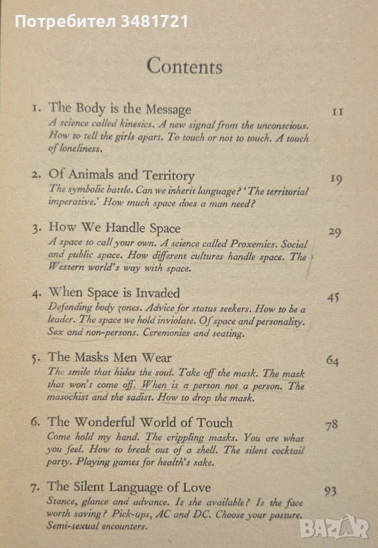 Авторът пише тази книга като своеобразна история и наръчник - от въпроси, свързани с биологията ни, през начините да разчитаме невербалната комуникация на приятели, непознати и партньори, до оптималните начини как самите ние да използваме тялото си така, за да кажем това, което искаме, но и за да създадем атмосферата, която ние самите търсим.