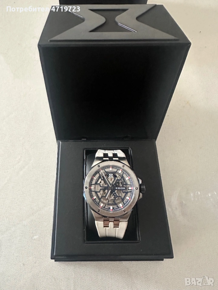 Предлагам модел Edox Delfin Mecano Automatic, който е в отлично състояние – както визуално, така и технически. Носи се малко и внимателно, в ротация от 4 други часовника. Часовникът е с много силно присъствие на китката и е истински акцент за всеки фен на модерните skeleton модели.