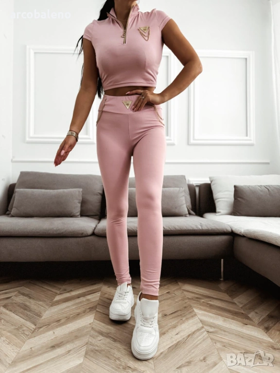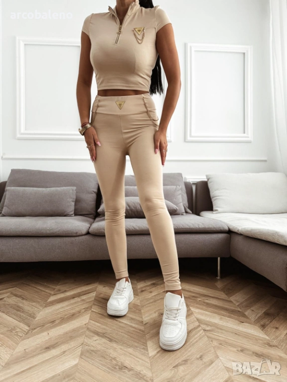 Дамският комплект се състои от къс топ с къс ръкав и цип отпред и клин с висока талия. Комплектът е в рипсен десен и има малки златни триъгълни лога както на яката на топа, така и на колана на клина.