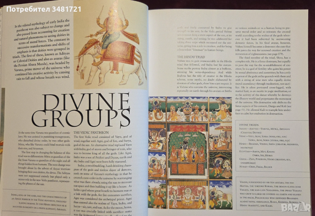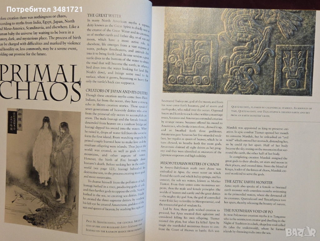 Книгата е подредена тематично, започвайки с раздел за митовете за сътворението на света, включващ информация за това как различните общества формулират появата на живота и планетата, както и нейните елементи(небе, вода, животни, хора и т.н.). Разгледани са митове от всички континенти, като е добавена и любопитна информация - например, значението на огледалата в японската и китайската митология.