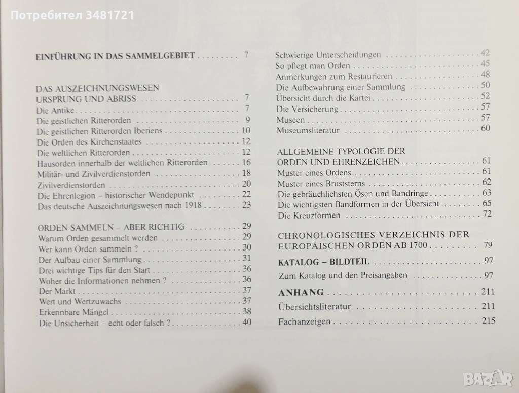 Книга, предназначена за колекционери. Тя включва история и описание на различните антикварни ордени, значки и други подобни предмети. Нейният фокус и цел, обаче, е не визуално представяне, макар то също да е доста богато, а да помогне на колекционера - как да направи правилен избор спрямо цена, състояние, сравнителен анализ и т.н. Представени са предмети от Европа, като в тях присъстват и български такива.