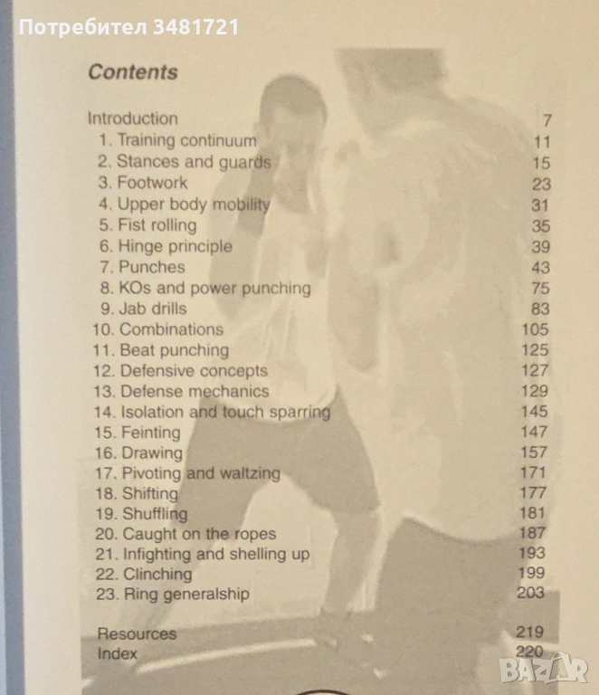 Това ръководство за тънкостите на бокса представя упражненията и постройката на ума, необходима за прехода от ентусиазиран начинаещ към опитен боксьор. Разглеждат се и основите за професионалния боксьор, офанзивните и защитните движения на ринга, финтовете, раунда, заедно с техники за клинч, "лов на глави", работа с тялото и последователност при контраатаки. Стратегии за бокс срещу високи и ниски противници, както и за различни бойни стилове, като "зареждане", "скоростен демон", "стик-енд-муув", "слъгър" и "уличен бияч", са разгледани подробно. Включени са специфични упражнения, фокусирани върху сложни стратегии на ринга, като изпълнение на сложни комбинации, пресичане на ринга, борба от въжетата, генериране на сила и забиване на противник в ъгъла. Всичко това - в текст и 900 снимки.