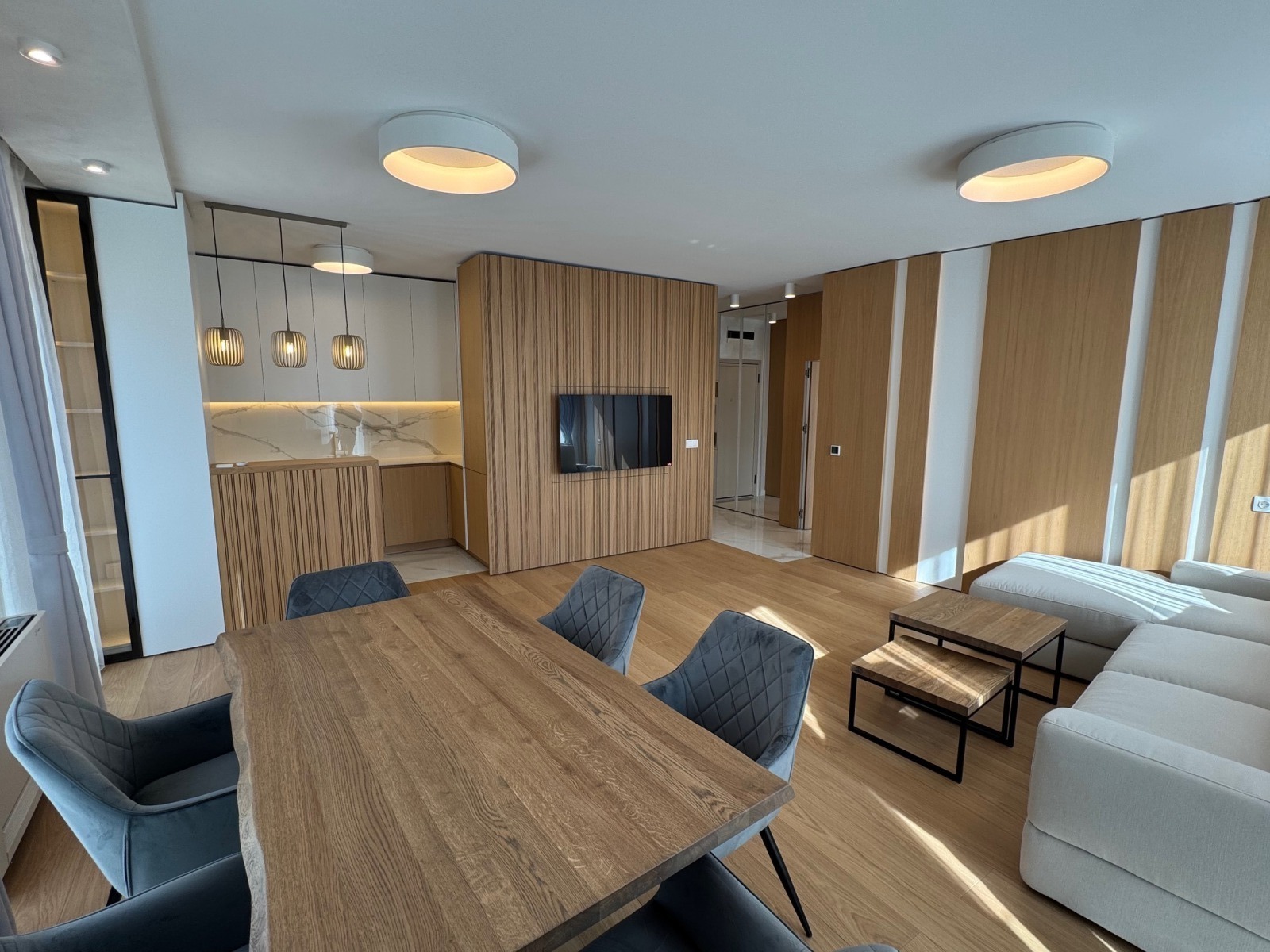 ✨ Интериор и обзавеждане: Апартаментът е изпълнен по индивидуален дизайнерски проект с изцяло луксозни материали и мебели по поръчка: Проектирани и изработени от Евро Мебел мебели, ламперии, кухненски плот и гръб от технически камък, MDF боя и естествен фурнир - дъб