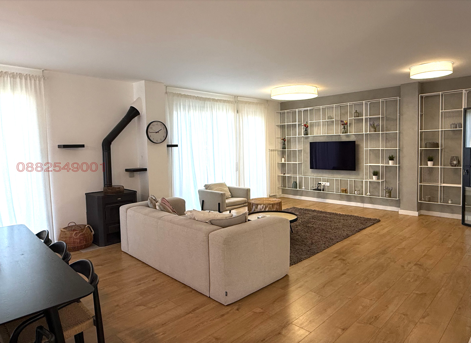 Етаж 1: Просторна дневна с отворен план, включваща кухня, трапезария и хол с камина. Тоалетна за гости.