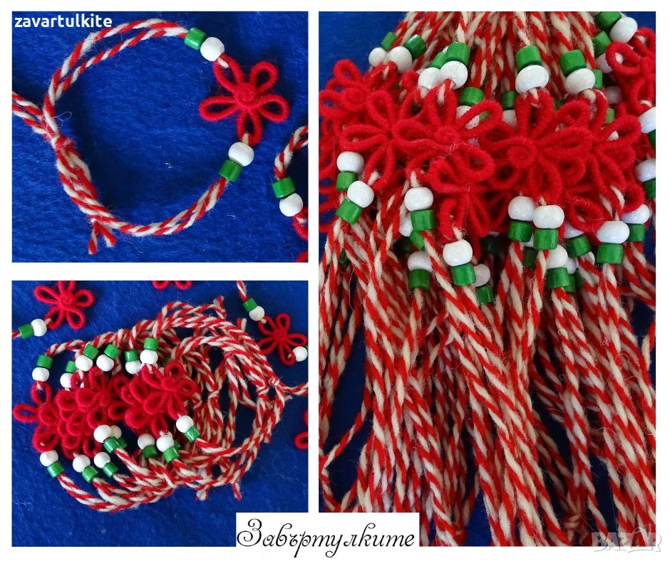 Мартеници гривни с вълнени конци и шарено или червено цвете → Обява 53253546