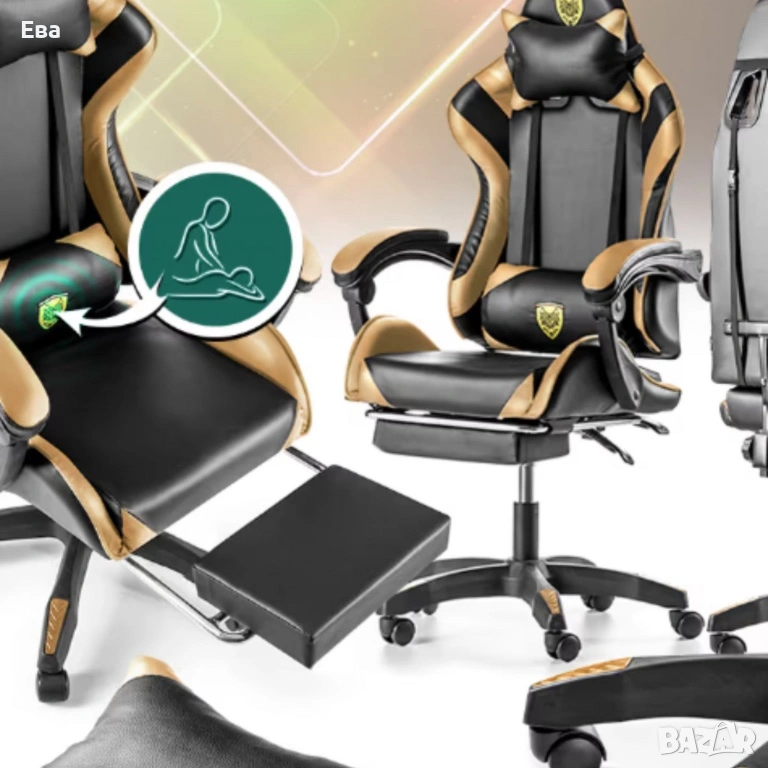 Черен геймърски стол с златисти акценти и разтегляема поставка за крака → Обява 53253600