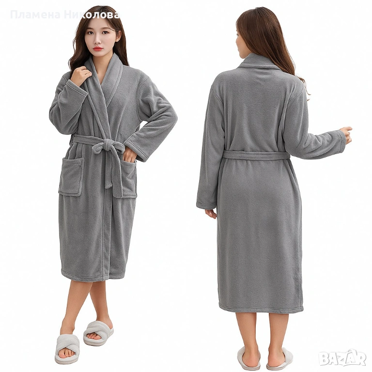 Дамски хотелски халат, класически, удобен, топъл, с връзки, мек, сив → Обява 53253717