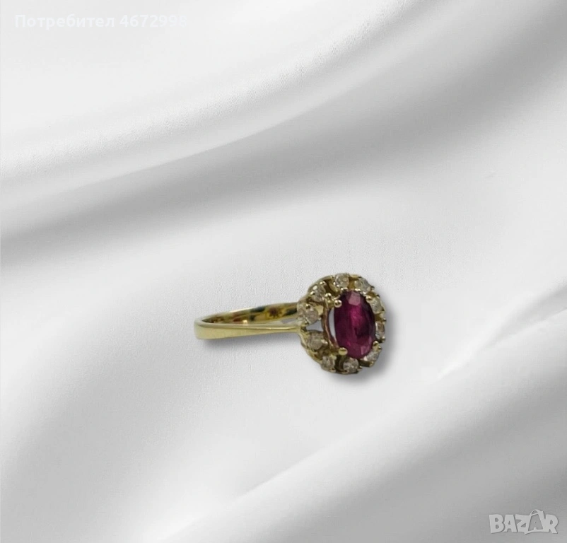 Уникален и елегантен дамски пръстен, ръчно изработен от 14-каратово жълто злато. В центъра е поставен овален рубин с наситен розово-червен цвят, обграден от блестящи естествени диаманти в класическа ореолна (halo) форма.
