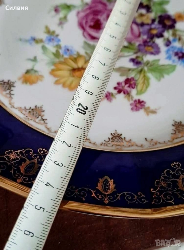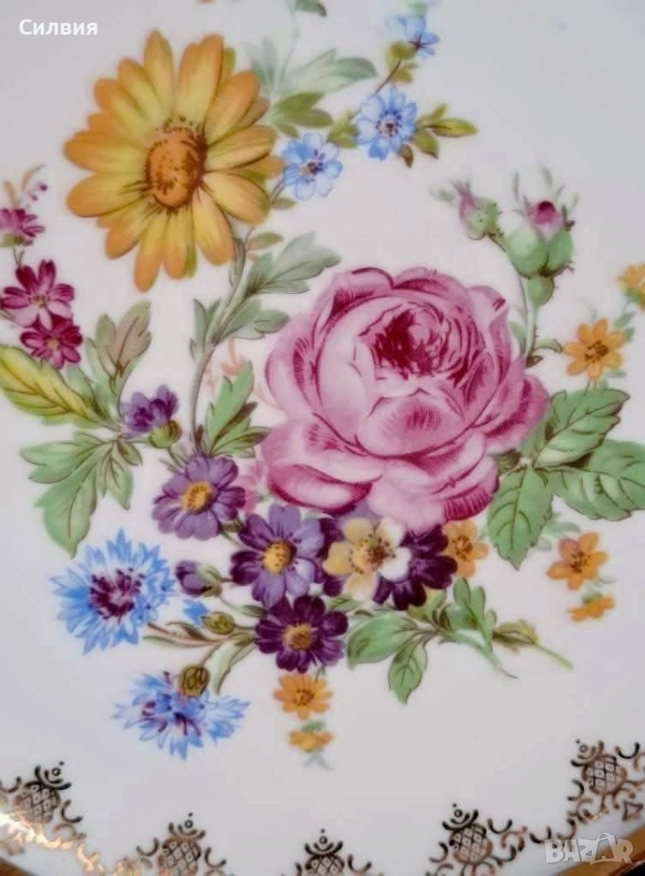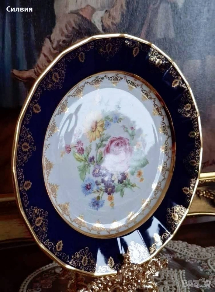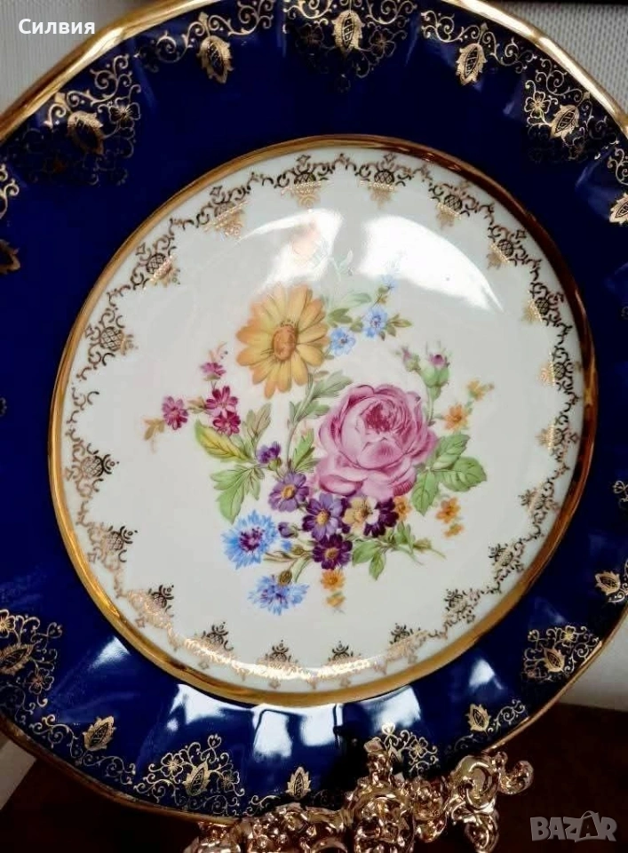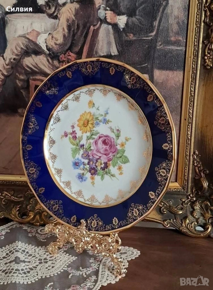 Винтидж Декоративна Чиния Epiag (Чехословакия) с Флорална Картина и Богата Позлата От средата на 20-ти век. Чинията съчетава класическа елегантност с богат декор. Центърът е декориран с пищна и реалистична флорална композиция – нежна роза, слънчоглед (или маргаритка) и букет от диви цветя в ярки, наситени цветове. Широк кобалтово син (наситен тъмносин) кант, който създава драматичен и луксозен контраст с белия порцелан. Цялата чиния е обилно украсена с фина и сложна 22-каратова позлата – деликатни дантелени мотиви и барокови орнаменти, които подчертават синия кант и обграждат централната картина. Отлично, запазено състояние, подходящо за колекция. Размер: Диаметър около 25 см. Тази чиния е предназначена предимно за декорация – перфектен акцент за витрина, шкаф или като чиния за стена. Идеален подарък за ценители на колекционерския порцелан и винтидж лукса. Добавете това изящно произведение на изкуството от Epiag към Вашата колекция! Цена 3️⃣8️⃣€ 74,32лв •✽✧✽•°”˜🦋”°•✽✧✽•°”˜🦋”°•✽✧✽•°”˜🦋”°•✽✧✽•°”🦋˜”°•✽✧✽•