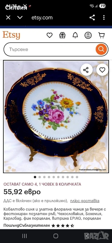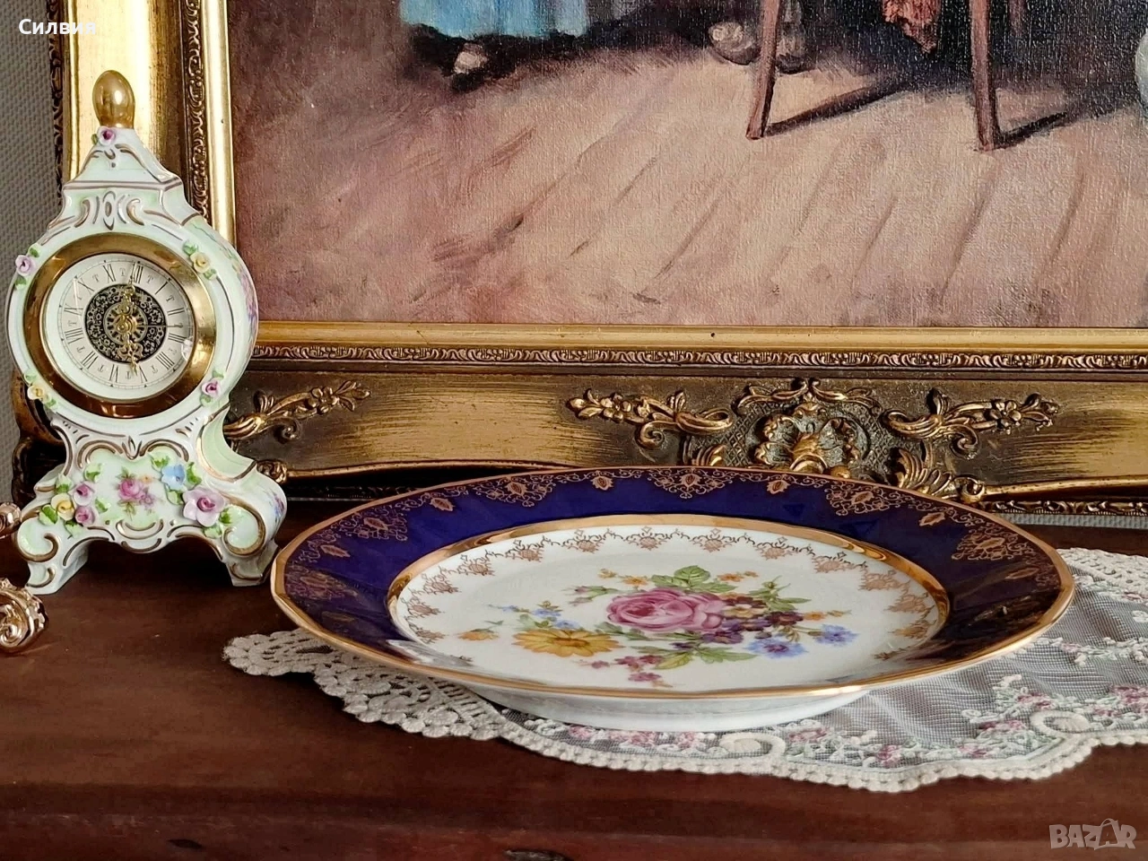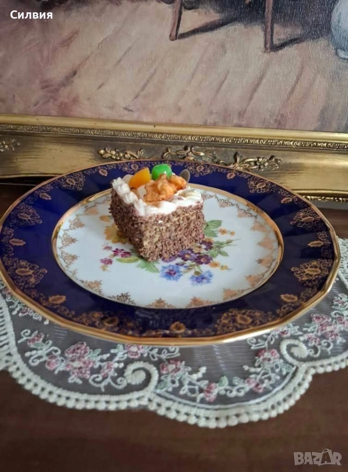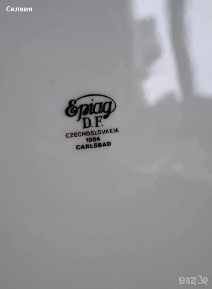 Винтидж Декоративна Чиния Epiag (Чехословакия) с Флорална Картина и Богата Позлата От средата на 20-ти век. Чинията съчетава класическа елегантност с богат декор. Центърът е декориран с пищна и реалистична флорална композиция – нежна роза, слънчоглед (или маргаритка) и букет от диви цветя в ярки, наситени цветове. Широк кобалтово син (наситен тъмносин) кант, който създава драматичен и луксозен контраст с белия порцелан. Цялата чиния е обилно украсена с фина и сложна 22-каратова позлата – деликатни дантелени мотиви и барокови орнаменти, които подчертават синия кант и обграждат централната картина. Отлично, запазено състояние, подходящо за колекция. Размер: Диаметър около 25 см. Тази чиния е предназначена предимно за декорация – перфектен акцент за витрина, шкаф или като чиния за стена. Идеален подарък за ценители на колекционерския порцелан и винтидж лукса. Добавете това изящно произведение на изкуството от Epiag към Вашата колекция! Цена 3️⃣8️⃣€ 74,32лв •✽✧✽•°”˜🦋”°•✽✧✽•°”˜🦋”°•✽✧✽•°”˜🦋”°•✽✧✽•°”🦋˜”°•✽✧✽•