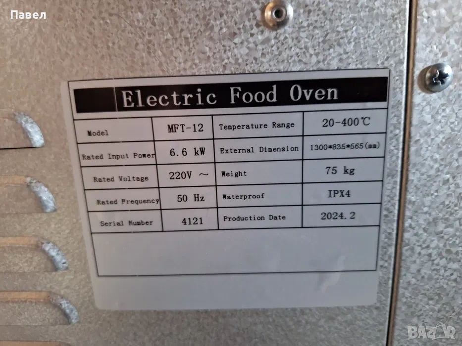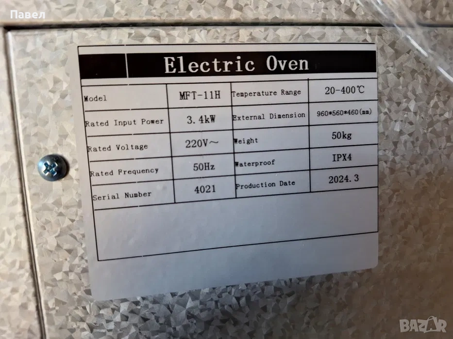 вътрешни размери -83/63/21см. Два терморегулатора -горен и долен- 20-400 градуса.