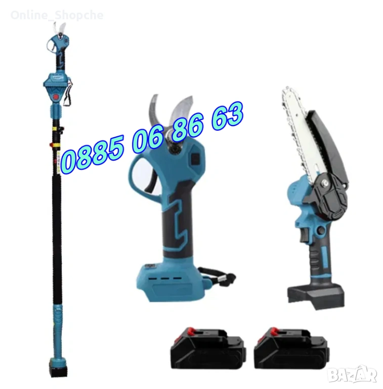 Комплект от акумулаторна лозарска ножица, акумулаторен мини верижен трион с 15 см шина и телескопичен прът 3 в 1 36V 8Ah с 2 вериги и резервен нож