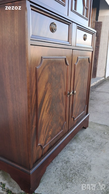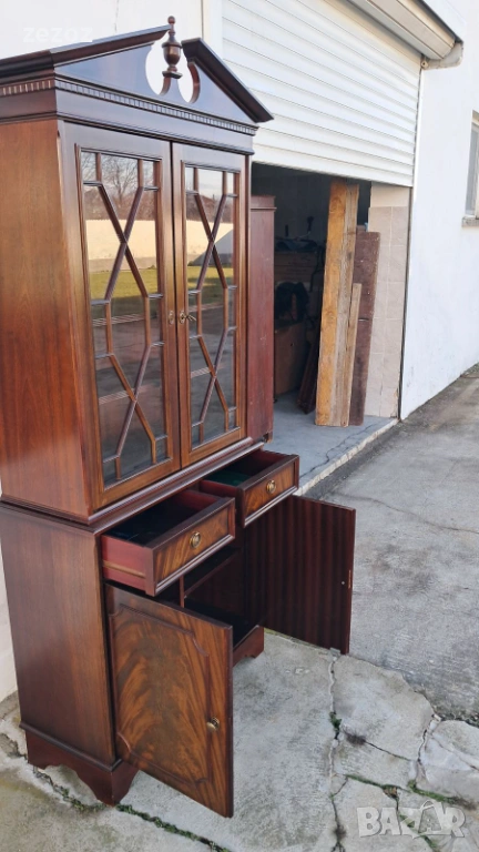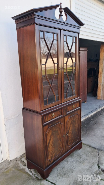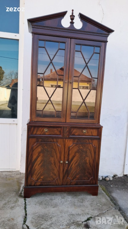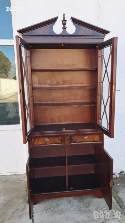 Елегантна класическа витрина.Нидерлански производител"HELDENSE MEUBELINDUSTRIE"По-съвременна интерпретация на стил "Класицизъм".Архитектурен завършек на витринната част.Горна остълкена част с геометрични решетки,идеална за показване на колекции.Витрината се дели на две и е в много добро състояние.Размери-