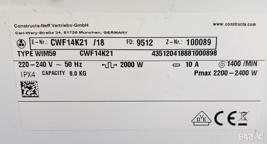 Пералня Constructa, произведена в Германия / клас А+++ / капацитет 8 кг. / 1400 оборота / с 15 основни програми ( памук, синтетика, вълна, финни, краткa, смесени, хигиенична, предпране и др.) + допълнителни (избор на температура и на центрофуга, отложен старт, икономия на време, за чувствителни, антинамачкване ) + голям LCD дисплей с оставащо време, голям люк, варио софт барабан за по нежна грижа към тъканите и бутон старт/пауза.