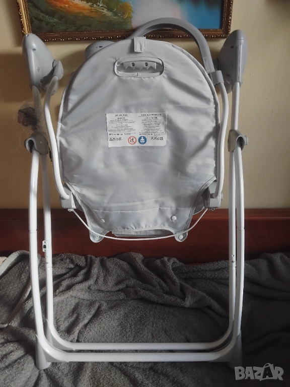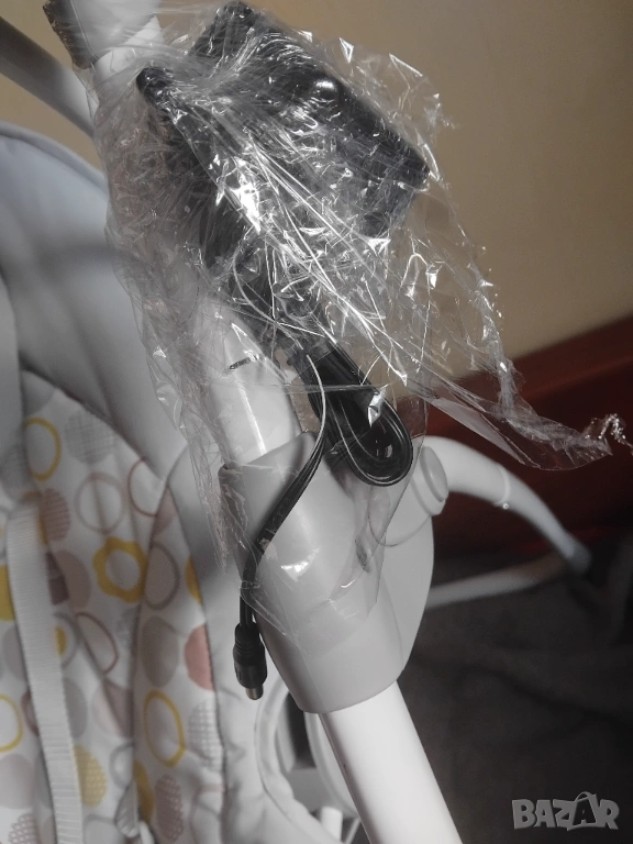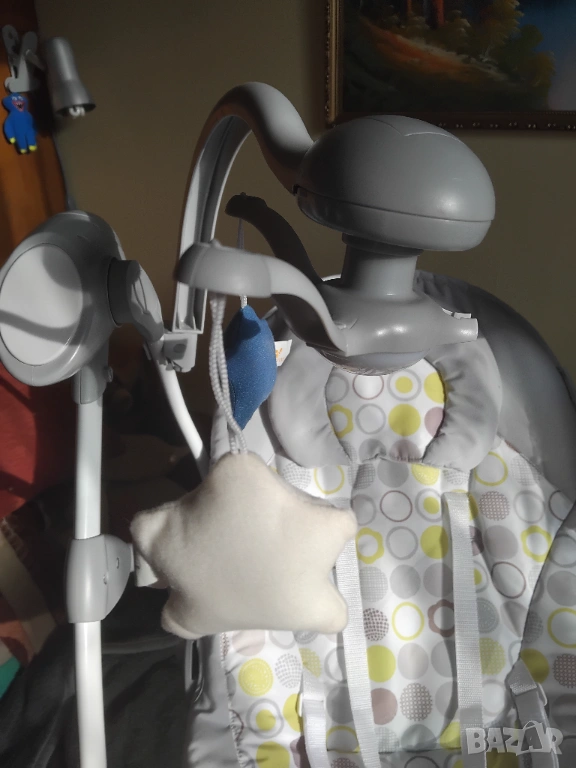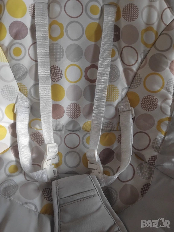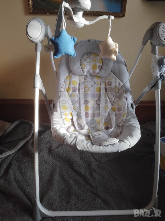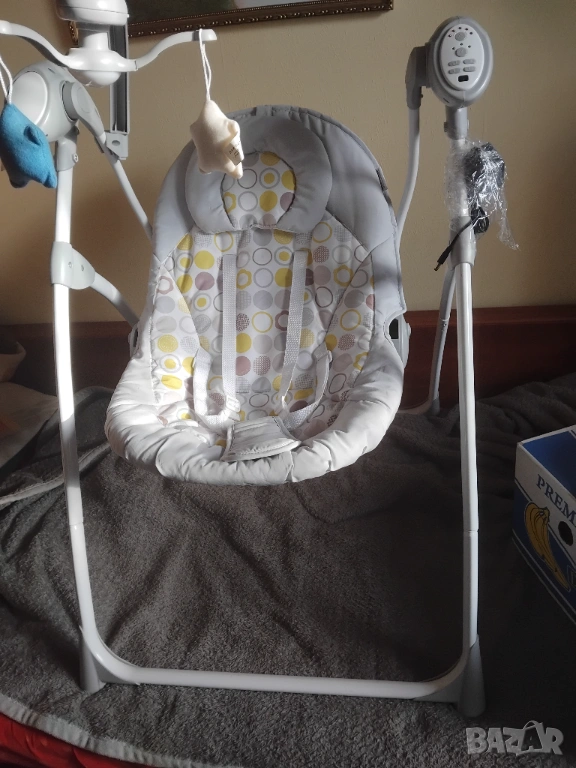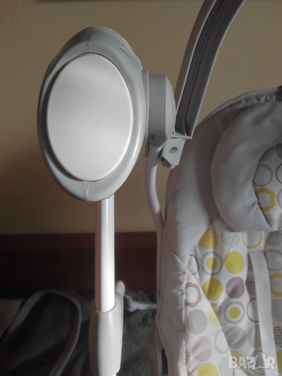 В отлично състояние с една малка забележка (липсва една от декоративните въртящи се играчки. Самия шезлонг а перфектен и чист. Без петна, мръсно и лекета по текстилната част!