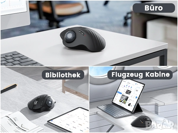 безжична мишка тип „тракбол“ (trackball), създадена с фокус върху ергономичността и удобството на потребителя при продължителна работа. За разлика от стандартните мишки, този модел позволява управление на курсора чрез палеца, без необходимост от движение на цялата ръка. Това решение, комбинирано с регулируемия наклон, ефективно намалява мускулната умора и напрежението в китката. Моделът е идеален за професионалисти, търсещи прецизност и комфорт, както и за работа в ограничени офис пространства.