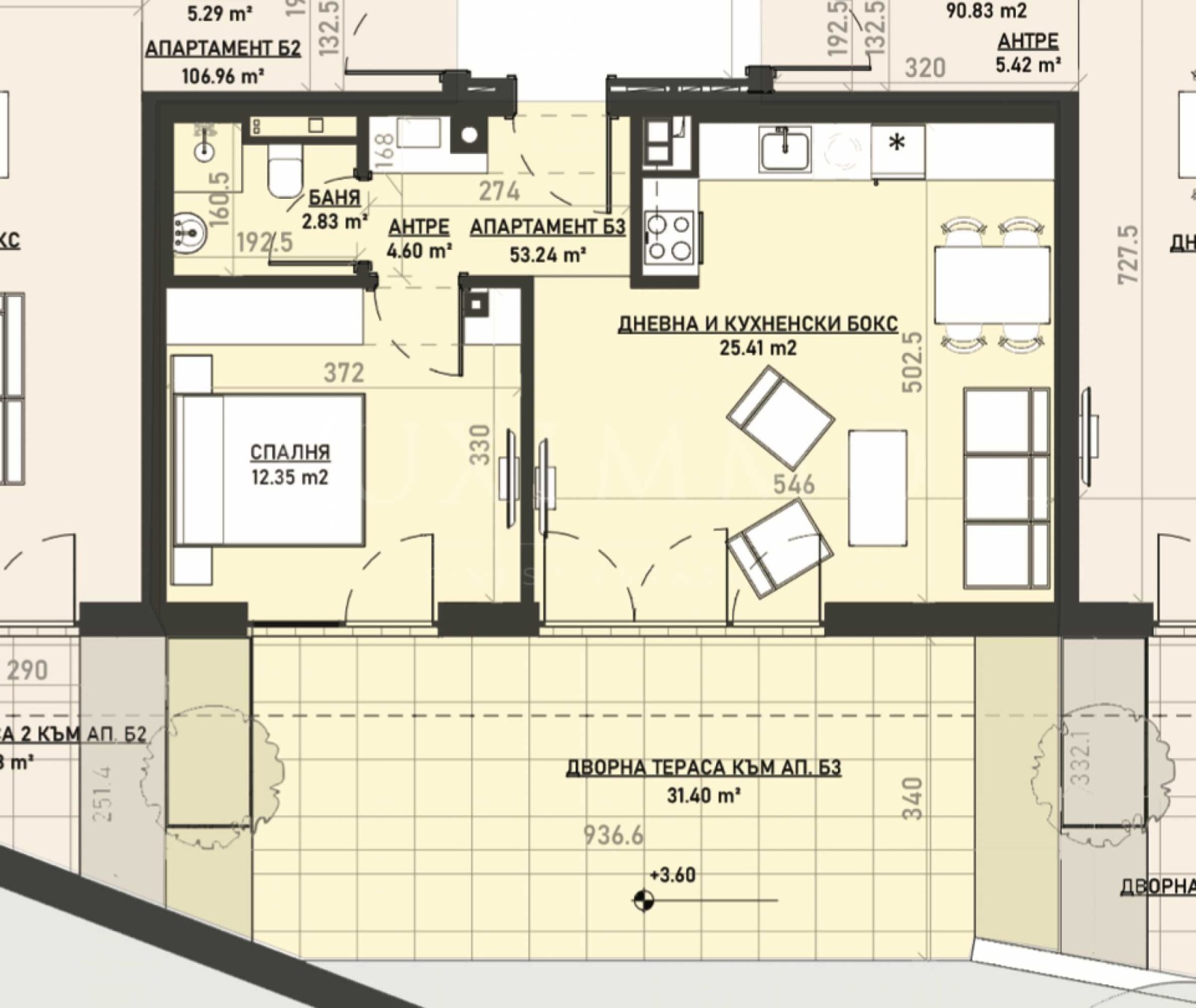 Просторният апартамент е разположен на първи етаж в сграда Б и има обща площ 59,81 кв.м, чиста площ 53,24 кв.м, както и собствен двор от 31,40 кв.м. Изложението е изцяло южно. Жилището се предлага в степен на завършеност по БДС, с газово отопление с подово отопление и изводи за климатици. Състои се от антре, баня/тоалетна, дневна с кухня и трапезария, една спалня, дворна тераса с излаз от двете стаи.