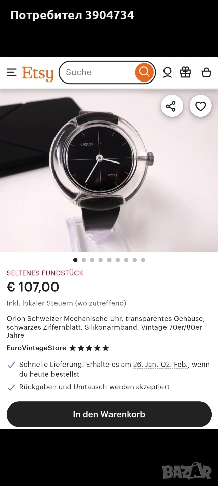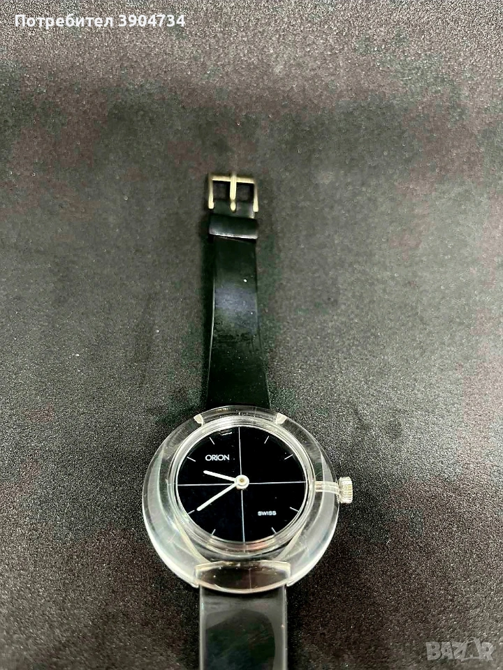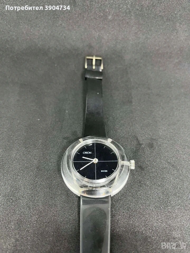 Винтидж часовник от началото на 80-те год Orion.Made in Switzerland.Механичен,прозрачен корпус,с оригиналната силиконова каишка(вижда се от маркировките).Работи точно.