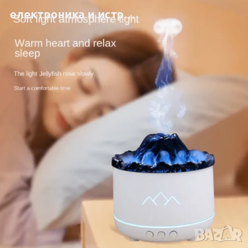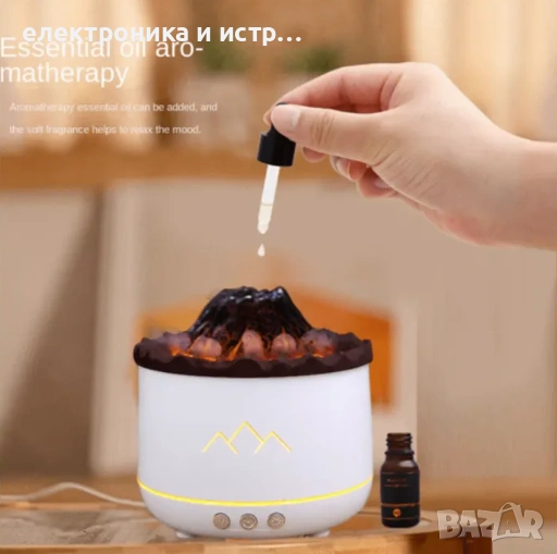Дифузер с ефект Вулкан: Използвайте като дифузер за етерични масла или овлажнител за стая. Дифузерът използва високочестотна ултразвукова пулверизация и LED светлини, за да симулира ефекта на естествения пламък. Можете да добавите няколко капки етерични масла, за да успокоите тялото и ума си.