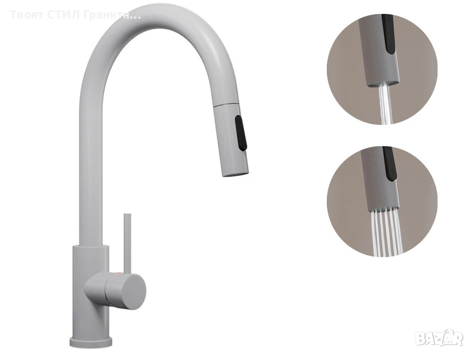 ✔️ Сив смесител с изтеглящ се чучур – 2 режима