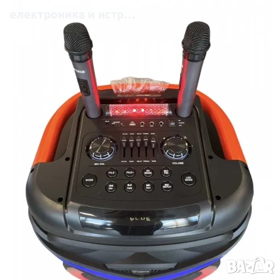 С 18-инчовия си басов говорител и впечатляващата мощност от 5000W, тази тонколона предоставя качествен звук със силен, но балансиран тон. Независимо дали сте на сцена или у дома, вие ще се потопите в плътен бас и кристално чисти високи тонове. Включените 2 броя безжични микрофона и преливащите светлини добавят забавление и интерактивност към вашите караоке парти и събития. С Bluetooth връзка, SD и USB входове, както и възможност за свързване на китара, тази тонколона предлага разнообразни възможности за възпроизвеждане на музика от различни източници. Със своята телескопична дръжка и здрави колела, тази тонколона е лесна за транспортиране, позволявайки ви да я носите навсякъде, където е нужен вашият звук.