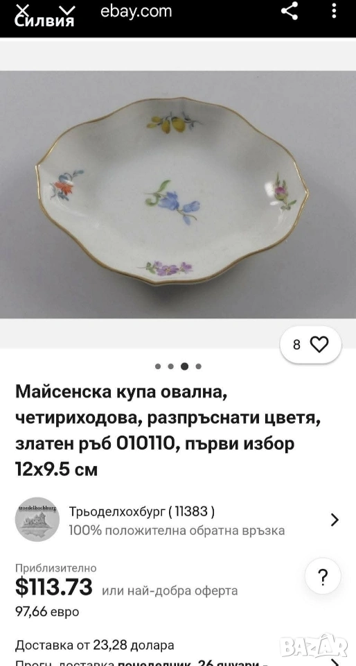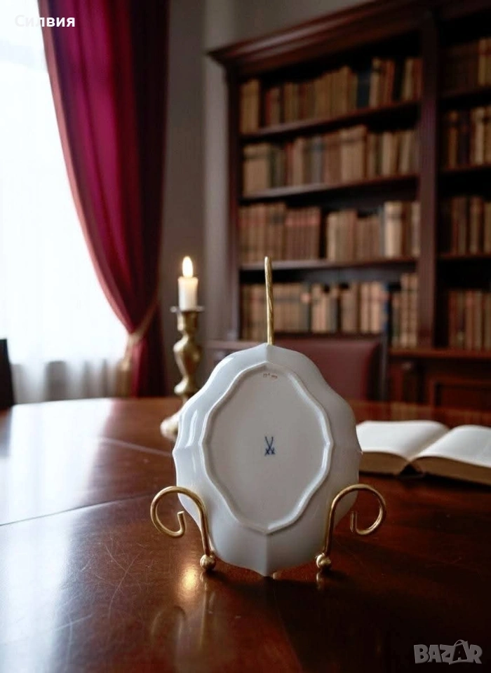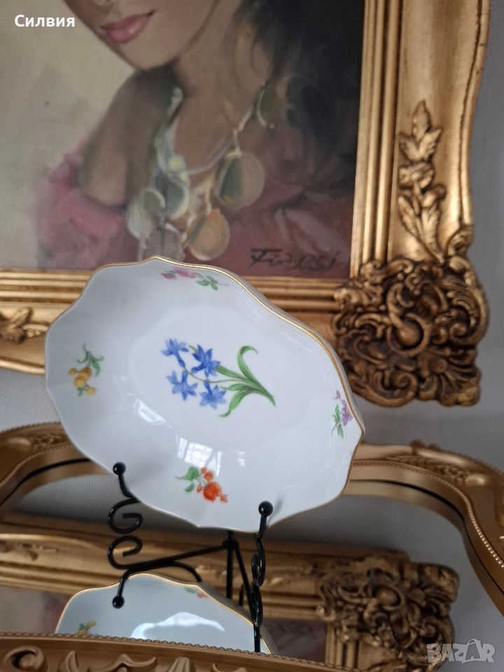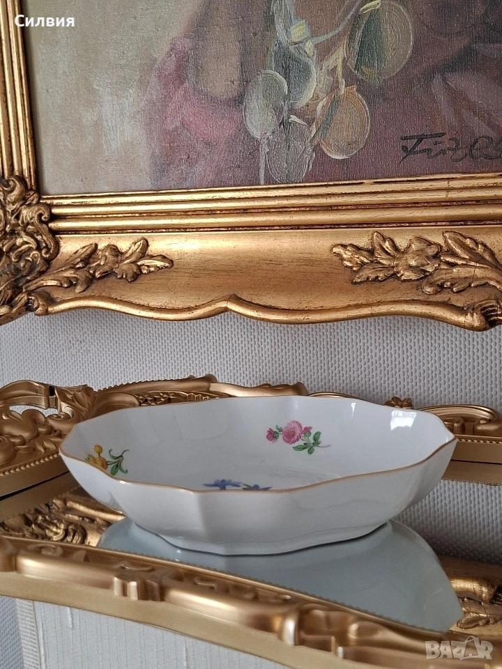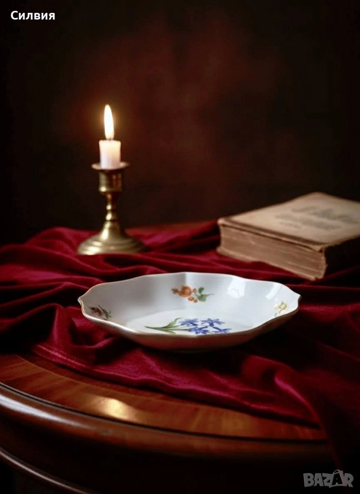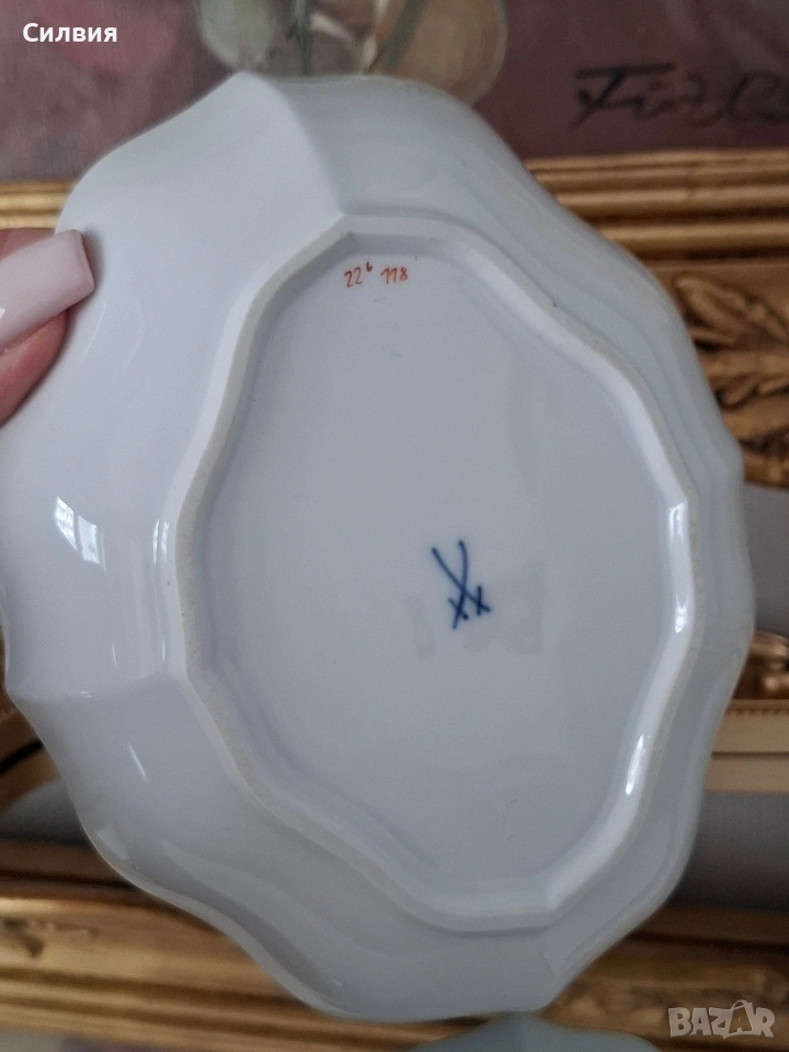 Meissen, скъпи!“ Ако порцеланът можеше да говори, тази малка купа вероятно щеше да Ви поздрави на чист френски (нищо че е германка) и леко да повдигне вежда, ако решите да сложите в нея обикновени солети. Защо Вашата масичка за кафе се нуждае от тази „дива“: Синя кръв (и цветя): Тя е толкова изискана, че дори цветята по нея изглеждат така, сякаш току-що са се върнали от следобеден чай в двореца. Сините камбанки в центъра са готови да зазвънят всеки път, когато някой влезе в стаята. Форма с претенции: Забравете за скучните кръгли чинии. Тази красавица има „кривици“ на правилните места – фестонираните ѝ ръбове са по-елегантни от воланите на бална рокля. Златният кант: Този тънък златен пръстен по ръба е там, за да Ви напомня, че тя е свикнала на лукс. Тя не просто стои на масата – тя позира. Малка, но със самочувствие: Със своите 15 см тя е перфектна за три изискани бонбона, един пръстен с диамант или просто за да кара гостите Ви да питат: „О, това от антиквариат в Париж ли е?“ Идеална за хора, които знаят, че животът е твърде кратък, за да се обграждат с предмети без история (и без малко позлата). ЕТО и няколко „Златни правила за съжителство с Meissen“: Никакъв досег с микровълновата: Тя смята модерните уреди за „варварски“ и може да Ви се разсърди с малко искри (все пак златото си е злато). Само за избрани деликатеси: Ако в нея попадне обикновена бисквита, тя няма да я превърне в трюфел, но определено ще я накара да се чувства по-важна. Гледайте, но с уважение: Тя обича да бъде център на внимание, така че ако я поставите до обикновена пластмасова чаша, може леко да пожълтее от възмущение. Точни размери:15/12/3см. ЦЕНА 8️⃣0️⃣€ 《156,47лв 》