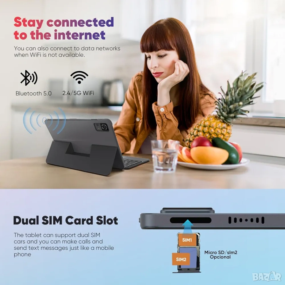 * Свързаност и комуникация: Таблетът поддържа Dual Band Wi-Fi (2.4GHz + 5GHz) за стабилна интернет връзка и Bluetooth 5.0 за периферия. Налични са два слота за SIM карти с поддръжка на 4G LTE, което позволява провеждане на разговори и използване на мобилен интернет независимо от Wi-Fi мрежите.