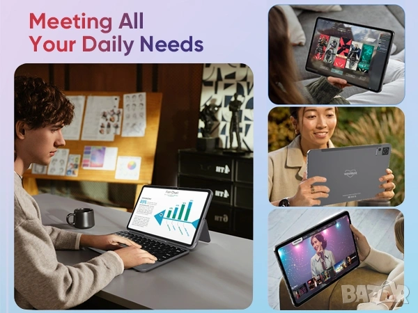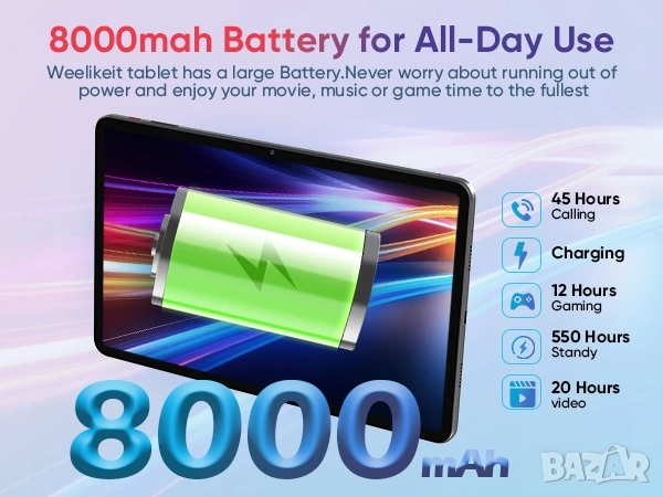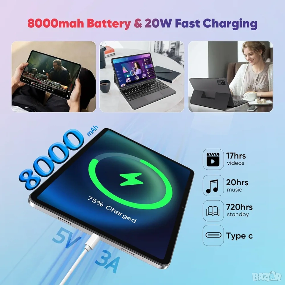 * Издръжлива батерия: Вградената батерия с капацитет 8000 mAh осигурява продължителна автономна работа (до 17 часа видео възпроизвеждане или 20 часа музика). Поддържа се 20W бързо зареждане през USB Type-C порт.