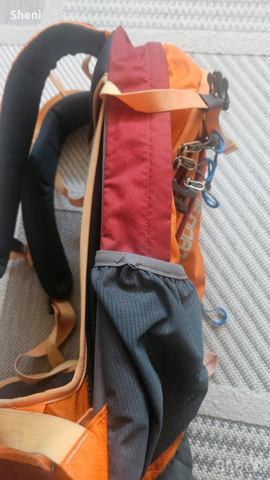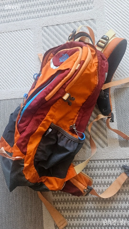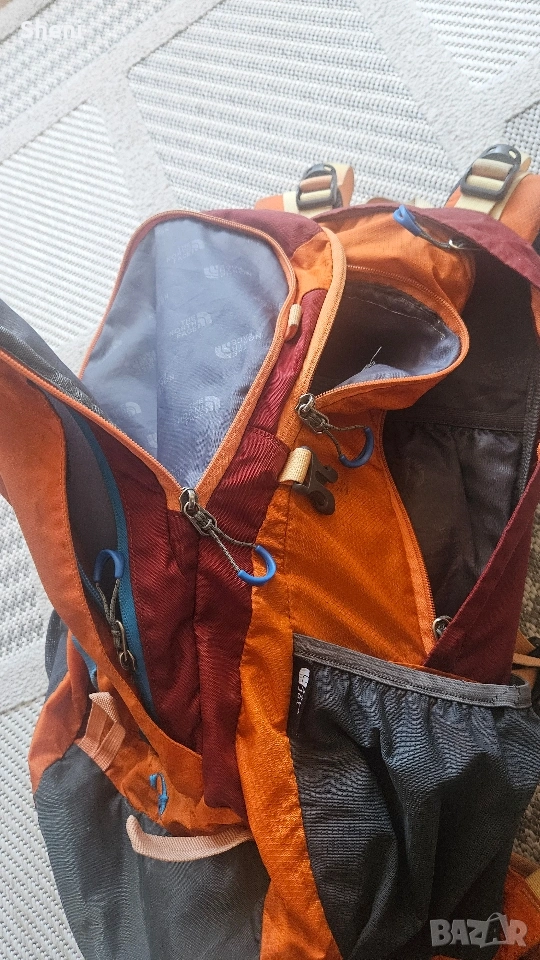 Раница The North Face с обем 40 литра, оранжева. Размери 50 на 30 см. Тежи 1115 грама с гърба и кръстния колан, които могат при желание да се свалят. Много функционална. Има доста джобове с ципове и отделения, включително странични и на колана. Има място за мех/ кемъл бек. Има дребни следи от употреба и скъсване на хастара на един от вътрешните джобове, което е снимано. Раницата е подходяща за туризъм, къмпинг, пътувания и различни видове активности и спорт.