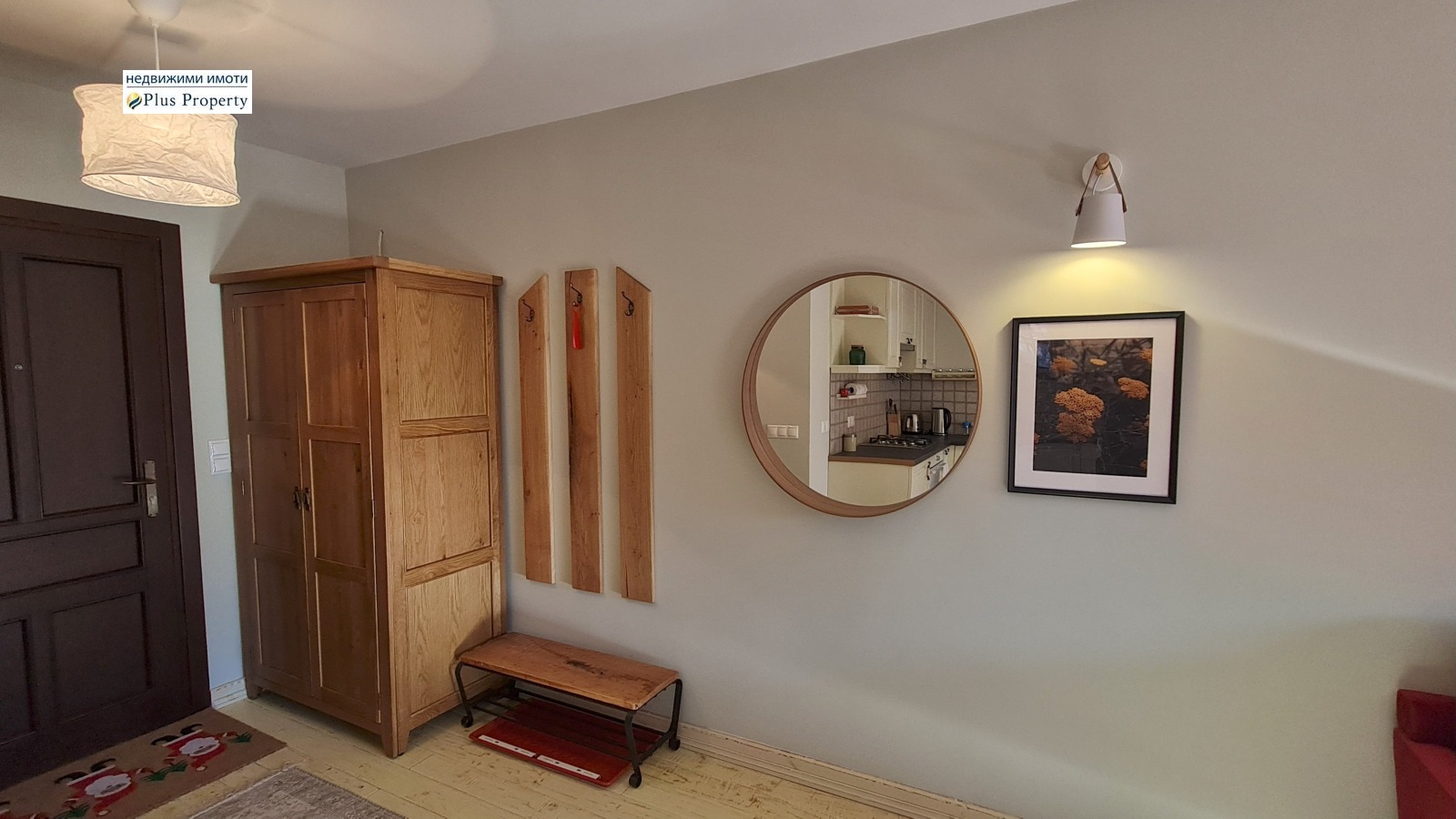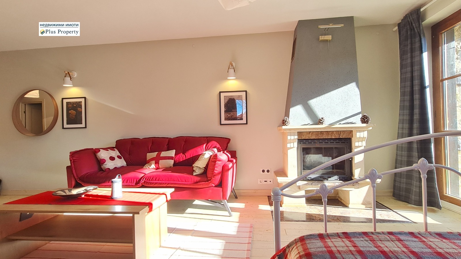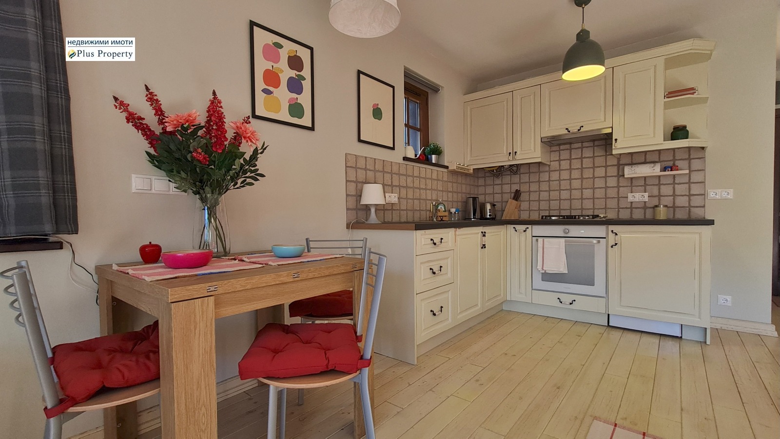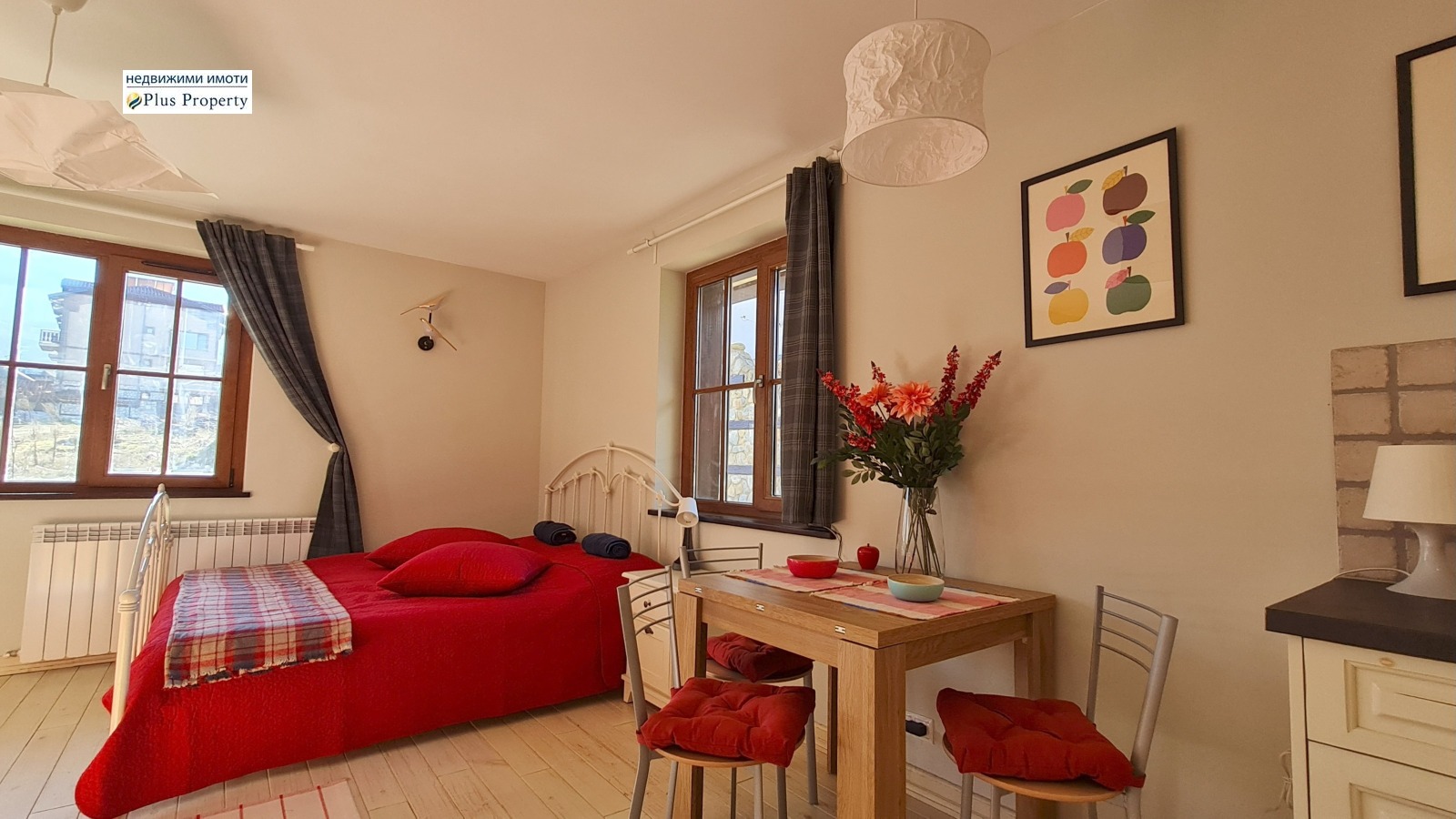 Имотът е завършен с висококачествени материали: подове от масивно дърво, луксозно завършена баня с каменни плочки, кухня от масивно дърво по поръчка с качествени уреди и красива камина на дърва.