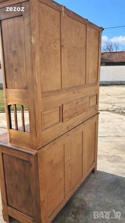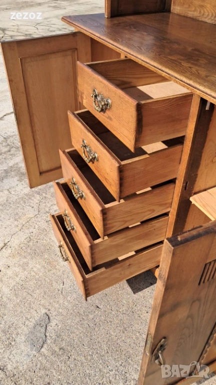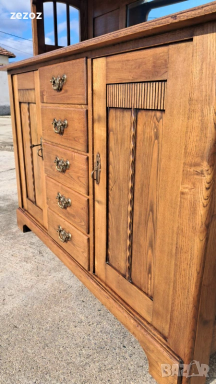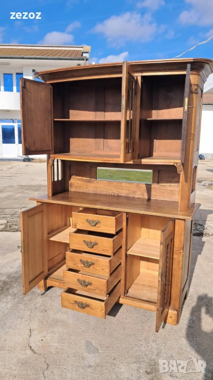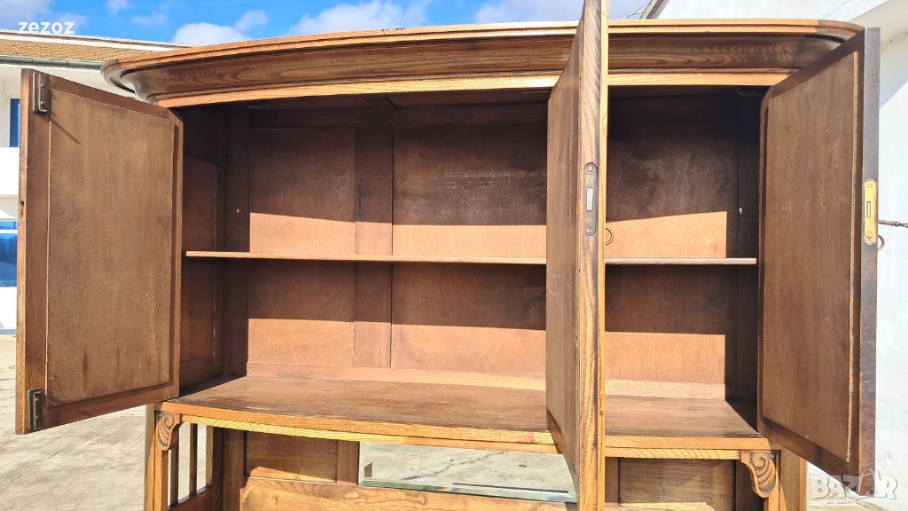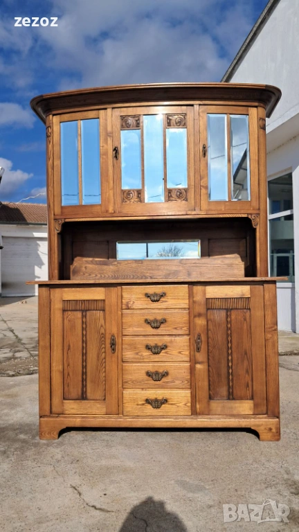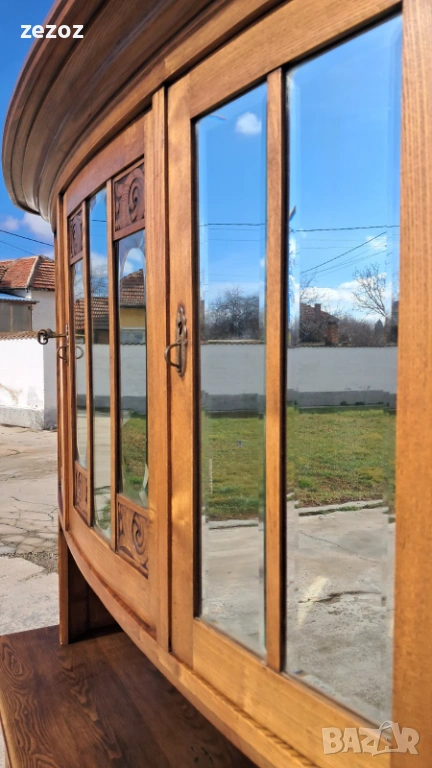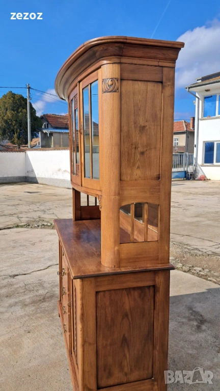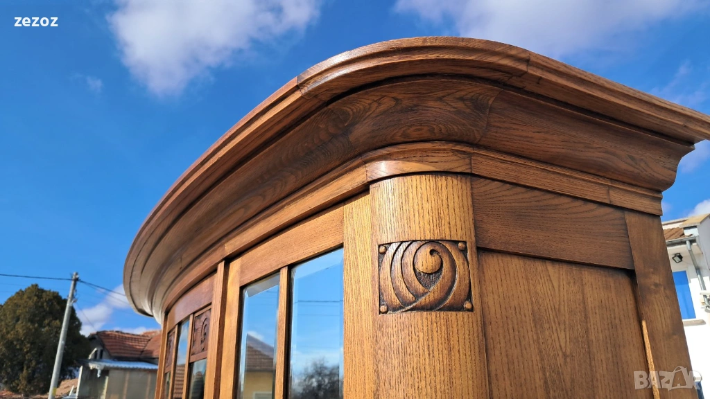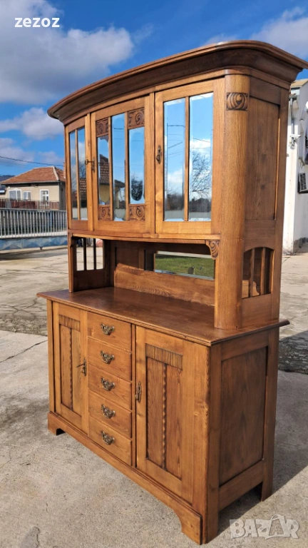 Много красив и качествен ретро шкаф с витрина изработен в Ар Нуво/Сецесион/ стил.Пълен дъбов масив.Плавни линии,флорална дърворезба.По особенното,е че това не са стъкла, фасетни огледала,като средните са с овален фасет.Шкафа е много запазен и на живо е още по-впечатляващ.Размери-