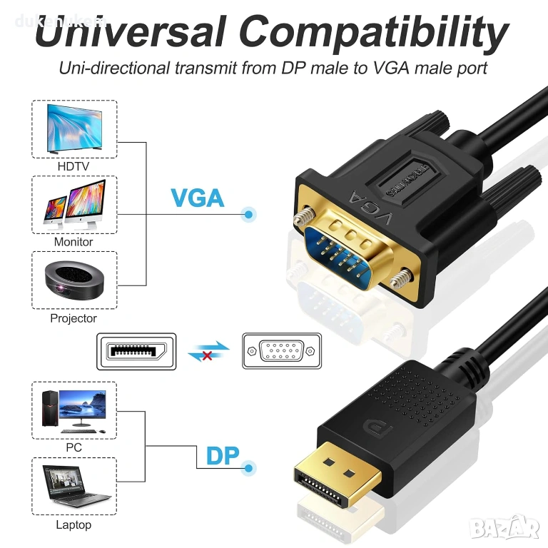 Важно: Кабелът работи само от DisplayPort (източник) към VGA (дисплей). Не поддържа обратна посока.